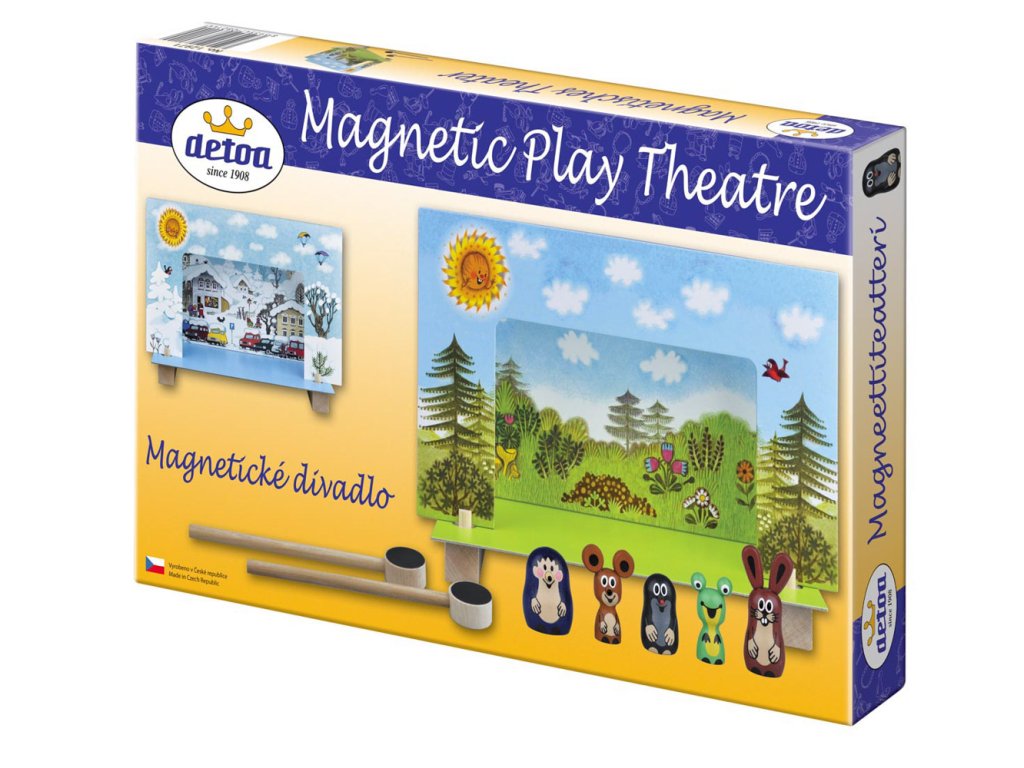 Magnetické divadlo Krtečka a jeho kamarádů obsahuje podstavce, dvoje kulisy z tvrdého papíru, dvoje vodící hůlky a 5 dřevěných figurek. Baleno v krabici z tvrdého papíru. Nevhodné pro děti do 3 let. Obsahuje malé části. Výrobek je zdravotně nezávadný.
