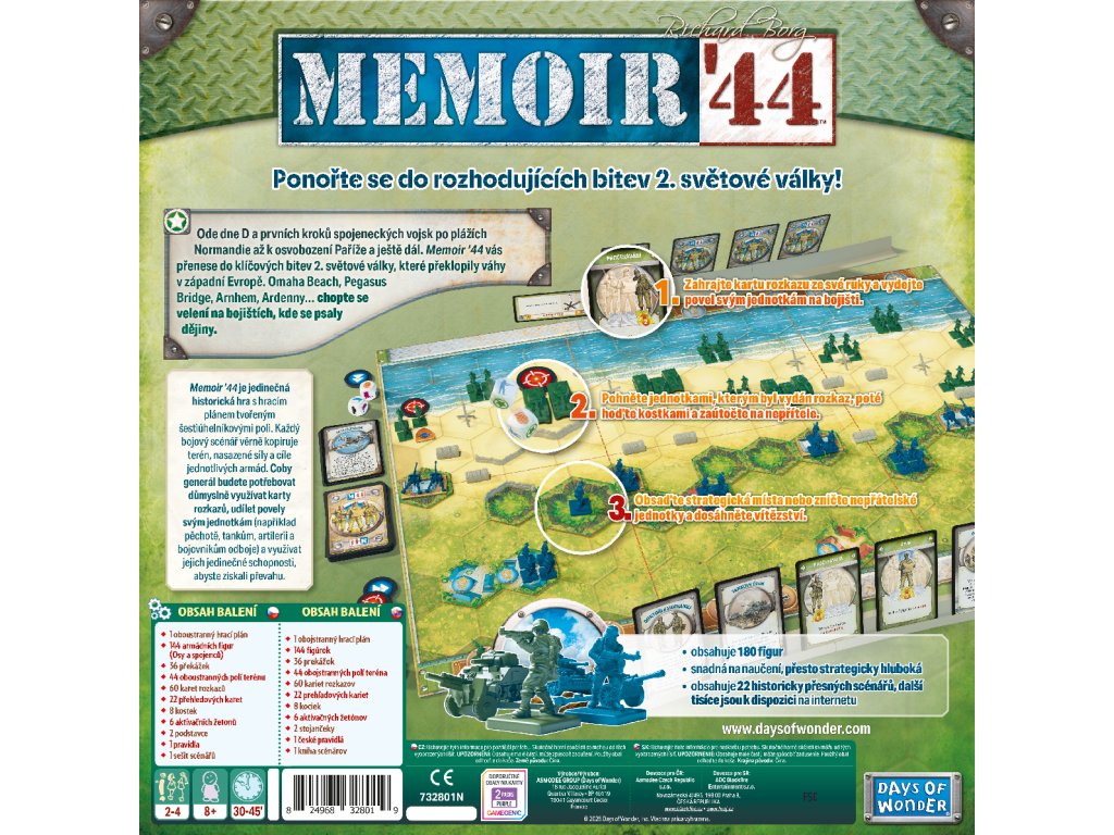 Memoir ’44 je jedinečná historická hra s hracím plánem tvořeným šestiúhelníkovými poli. Každý bojový scénář věrně kopíruje terén, nasazené síly a cíle jednotlivých armád. Coby generál budete potřebovat důmyslně využívat karty rozkazů, udílet povely svým jednotkám (například pěchotě, tankům, artilerii a bojovníkům odboje) a využívat jejich jedinečné schopnosti, abyste získali převahu.