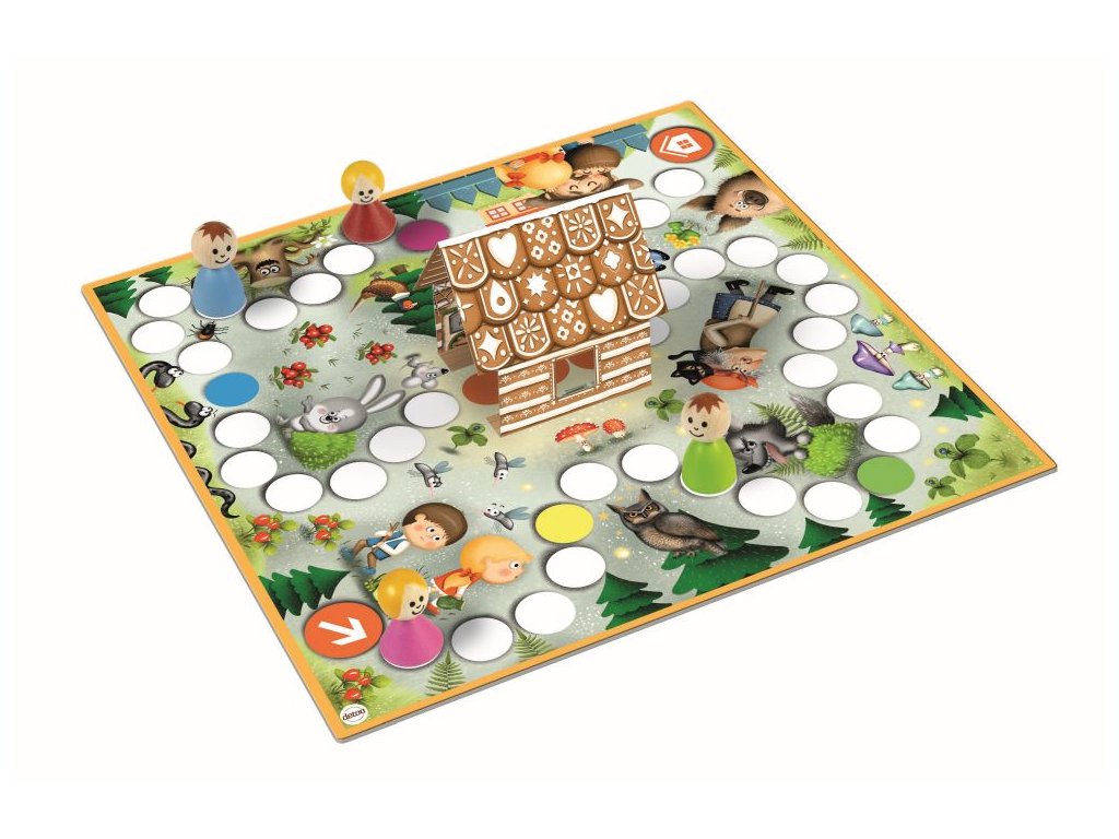 Malebná hrací deska je doplněna o 3D chaloupku. Součástí balení jsou dva Jeníčcci a dvě Mařenky.