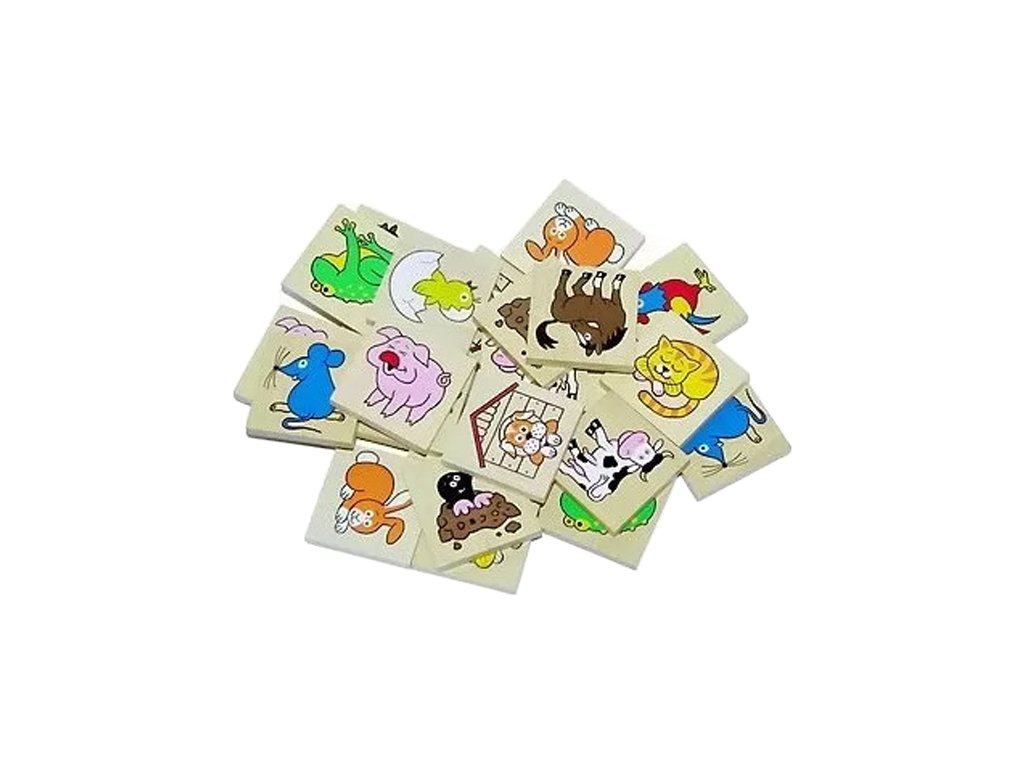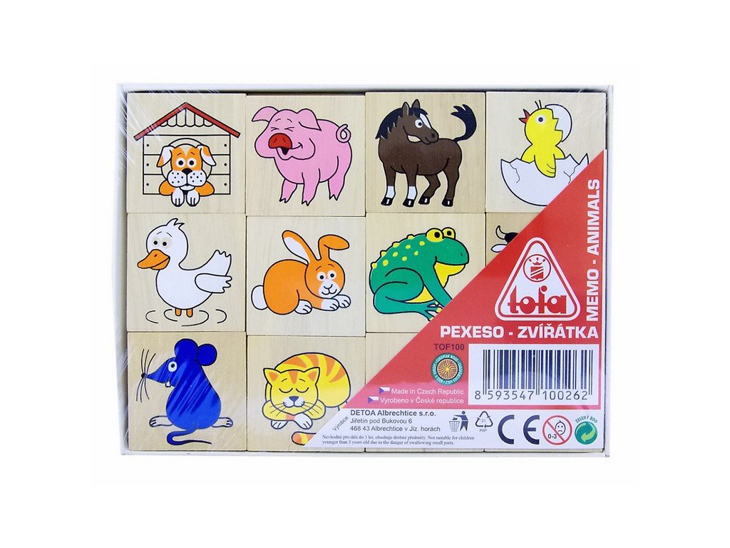 Dřevěné pexeso s obrázky zvířátek pro procvičení soustředění a paměti. Děti se zábavnou formou naučí poznávat zvířátka se kterými se mohou běžně setkat. Hra obsahuje 24 kusů o velikosti 40 x 40 x 6 mm.