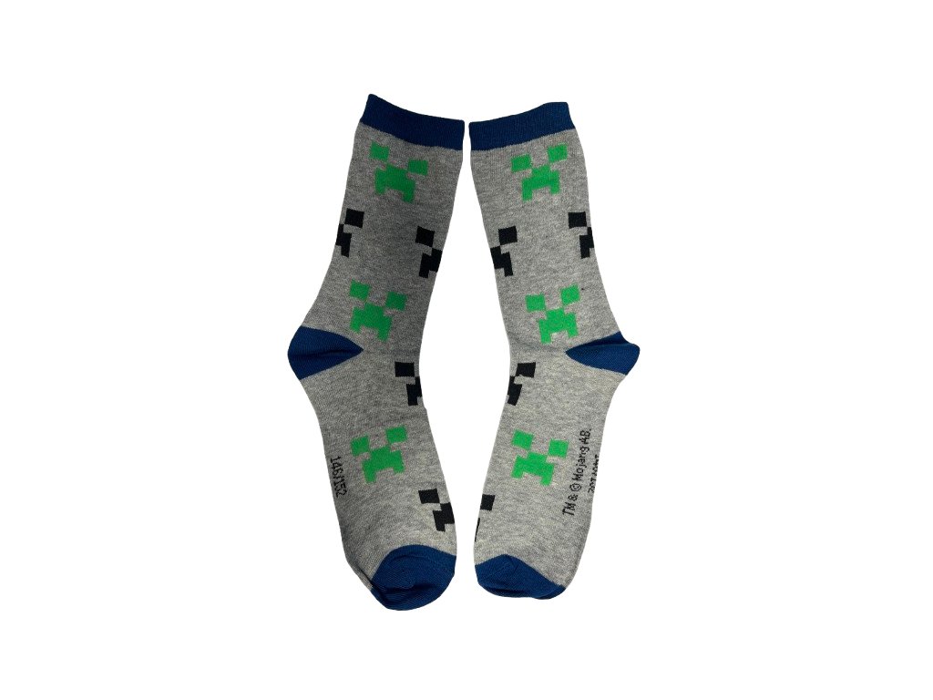 2. pár ponožek je vyvedený v šedé barvě s grafikou ikon Creeperů v černé a zelené barvě.