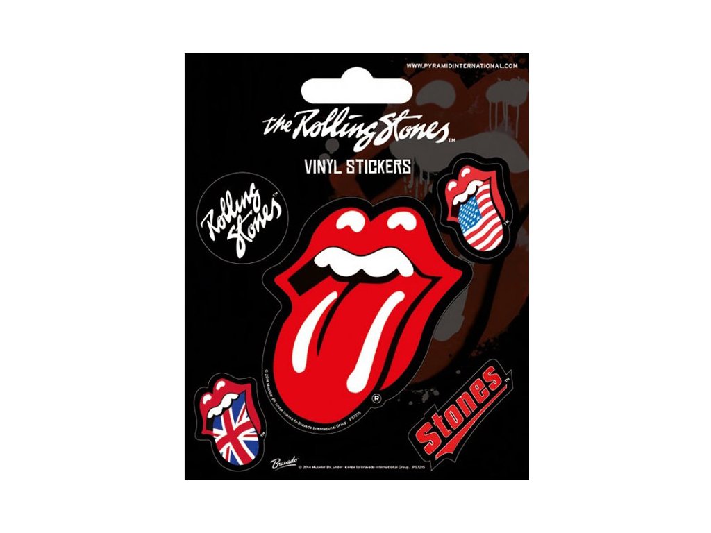Oficiální samolepky z katalogu produktů s logem, fotografiemi a grafikou slavné britské rockové skupiny Rolling Stones.