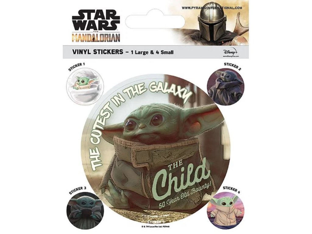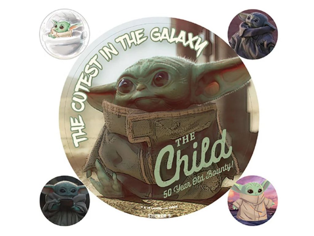 Oficiální samolepky a doplňkové zboží z katalogu produktů s licencí TV seriálu The Mandalorian od Star Wars (Hvězdné války).