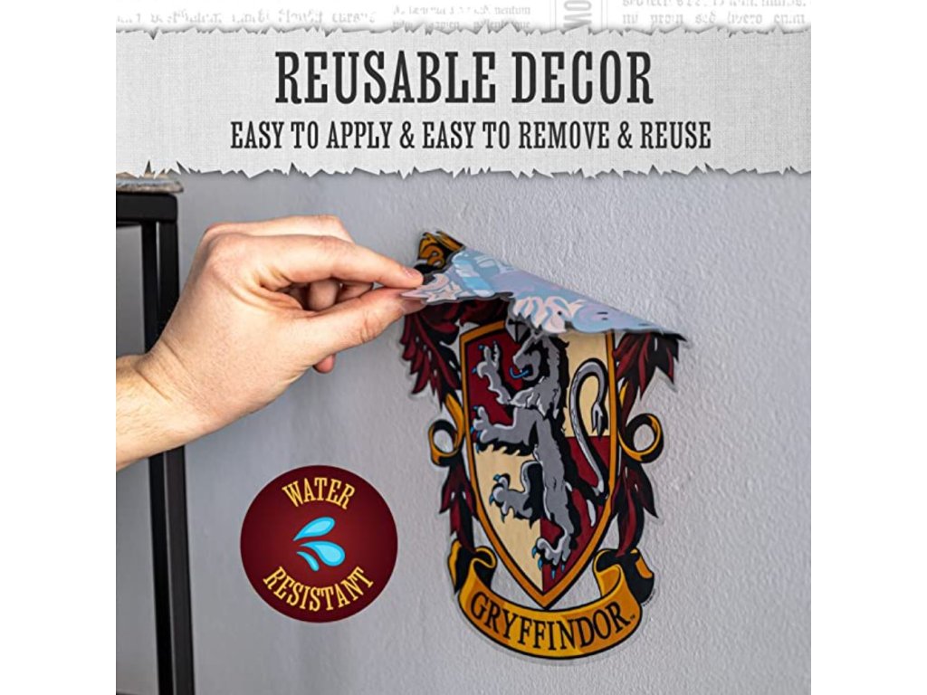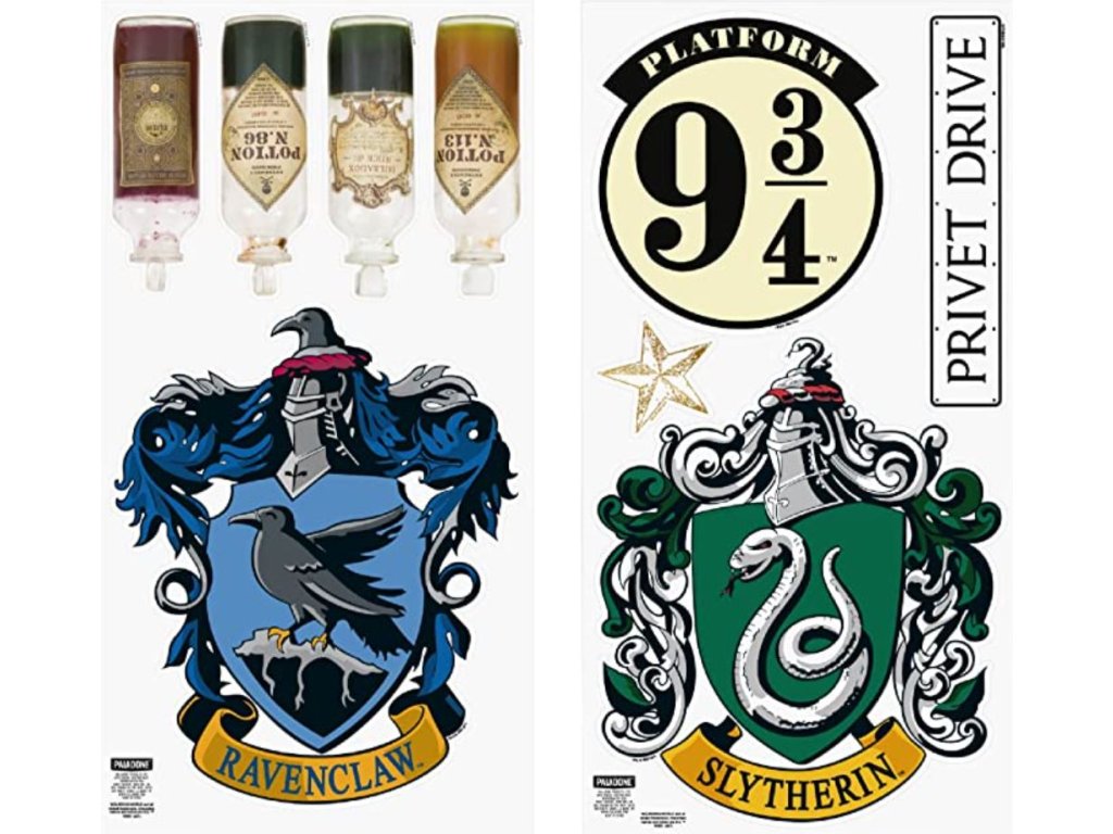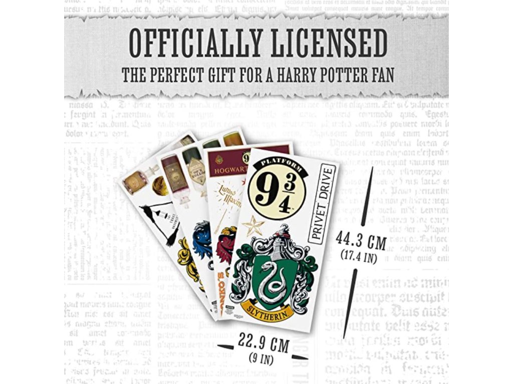 Balení čtyř listů, které v celkovém součtu obsahují 20 samostatných kusů voděodolných samolepek se symboly a grafikou z filmu Harry Potter.