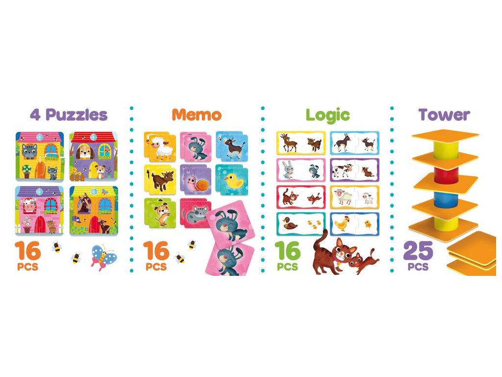 Krásná sada 4 různých her pro malé děti. Sada obsahuje pexeso (16 kusů), puzzle (4 obrázky), spojení máma a mládě (16 kusů) a věž (25 kusů). Vyrobeno z bezpečných materiálů vhodné pro děti od 1 roku.