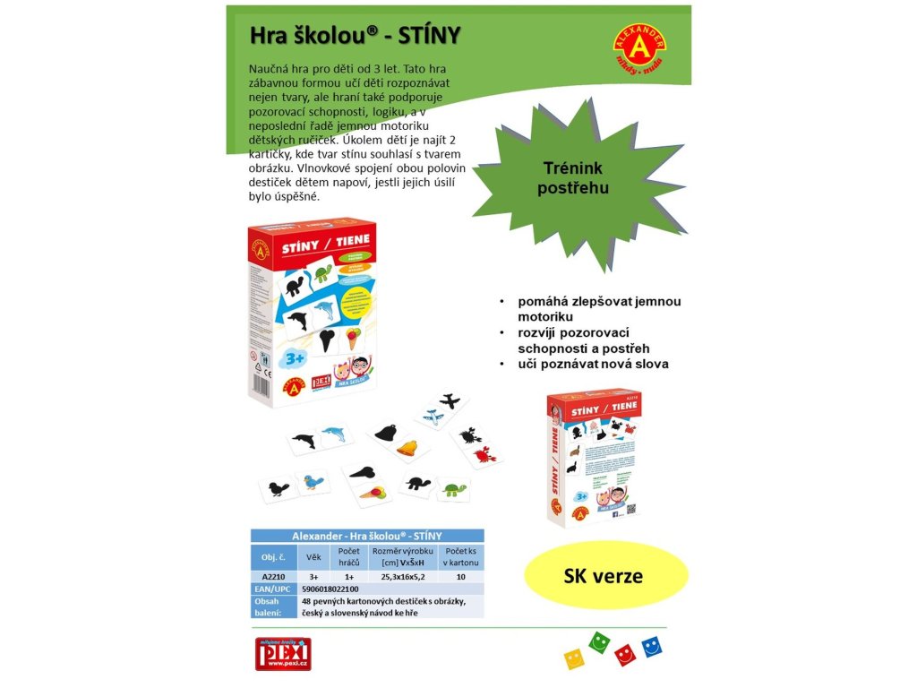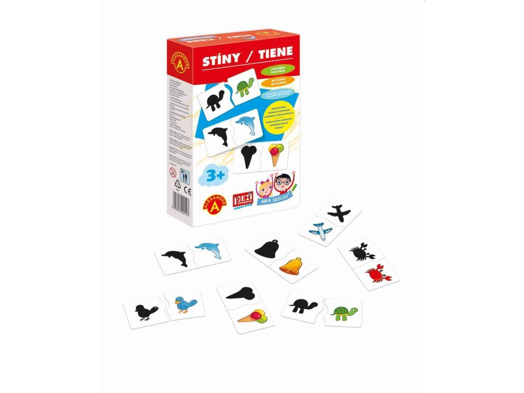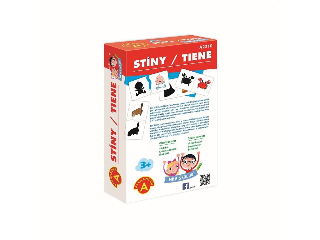 HRA ŠKOLOU® - STÍNY je naučné hraní pro malé objevitele od 3 let rozvíjí kombinační schopnosti, pozorování a postřeh. Sestav a poznej 24 dvojic složených ze stínu a barevného obrázku zvířat, hudebních nástrojů a věcí z každodenního života.