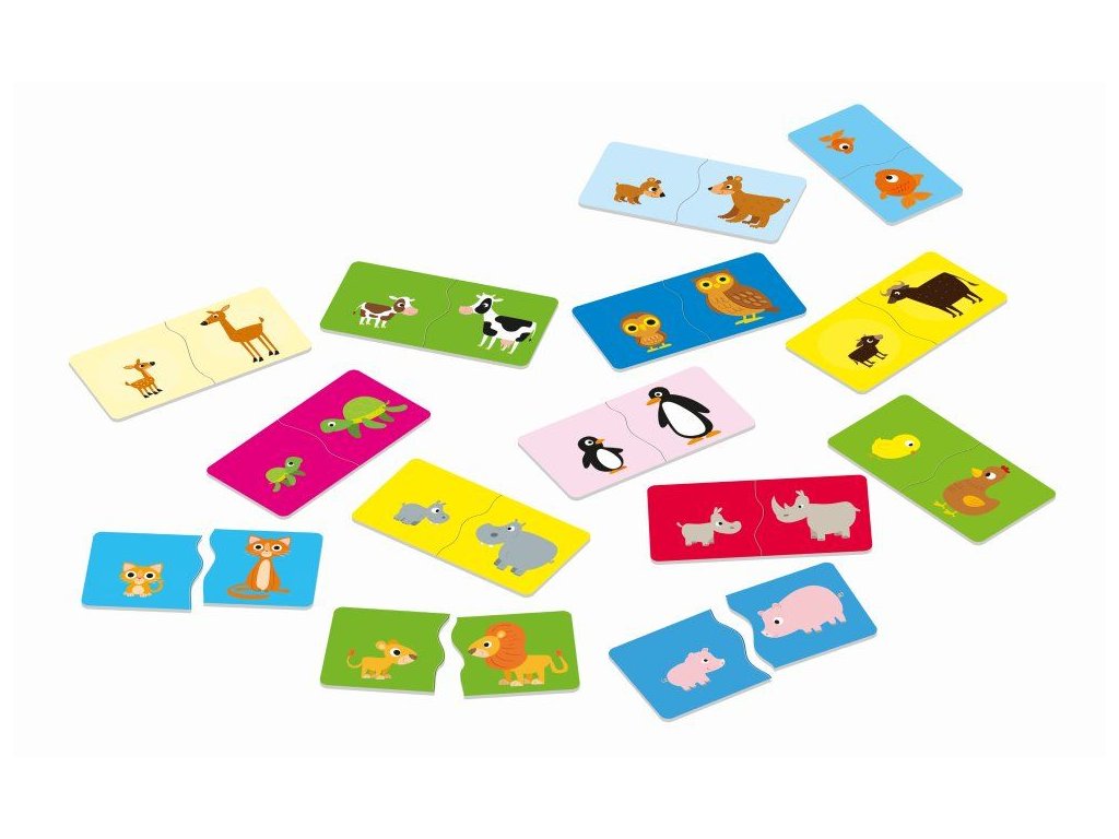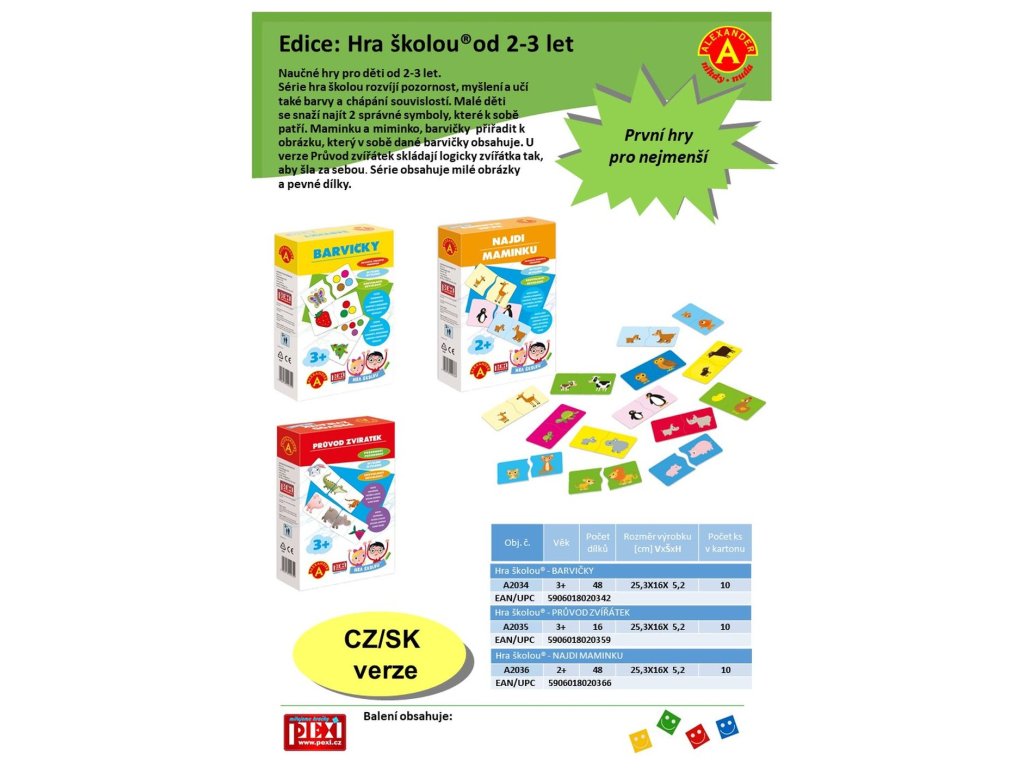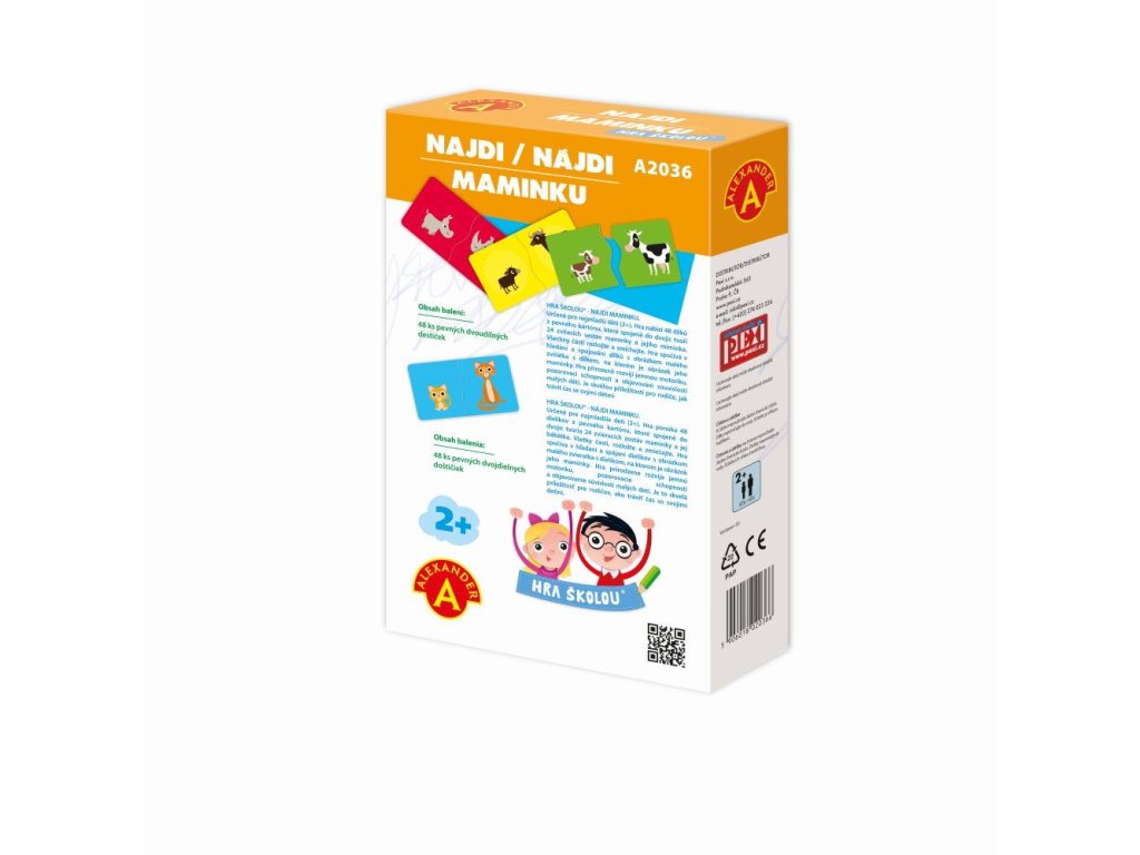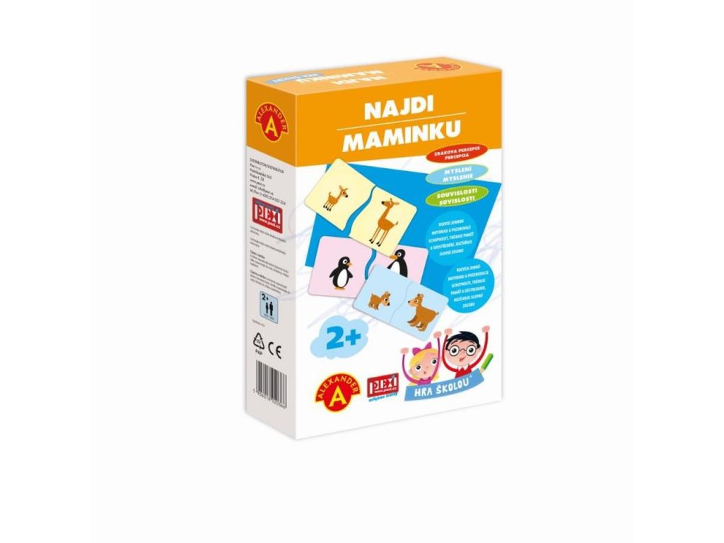 Naučné hraní pro malé objevitele. Krabička "HRA ŠKOLOU® – NAJDI MAMINKU", pro děti již od 2 let, je plná zvířátek. Pomocí dvoudílných velkých kartiček se děti učí se pojmenovat zvířátka a hledají mláďátka k jejich maminkám. Tvar spojení jim napoví, jestli opravdu našli správnou dvojici.