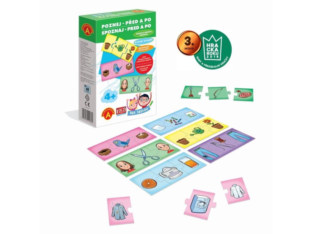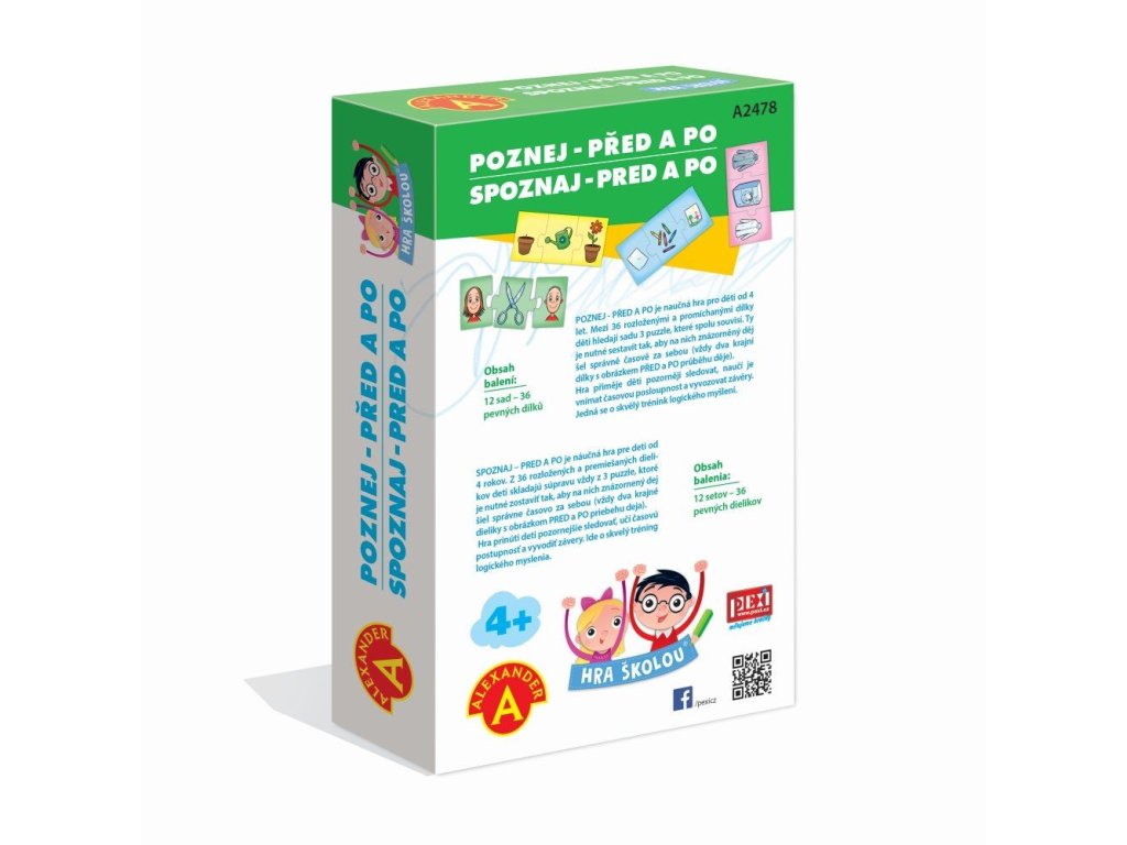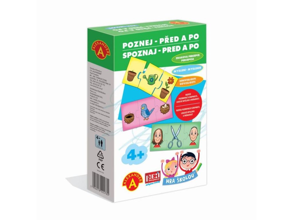 Hra školou® POZNEJ - PŘED A PO je naučné hraní pro malé zvědavce od 4 let, při kterém poznávají a upevňují znalosti o tom, co se děje PŘED a co PO. Každý případ se skládá ze 3 kartiček s vyobrazením události. Dětem při skládání pomáhají tvary dílků. Mezi 36 rozloženými a promíchanými dílky hledají děti sadu 3 společných dílků, které spolu souvisí. Ty je potřeba sestavit tak, aby na nich znázorněný děj šel správně časově za sebou (vždy dva krajní dílky s obrázkem PŘED a PO průběhu děje). Hra naučí děti pozorněji sledovat, naučí je poznávat časovou posloupnost a vyvozovat závěry. Jedná se také o skvělý trénink logického myšlení. Hra obsahuje: 36 pevných dílků s barevnými ilustracemi, které mají specifický tvar pro snazší spojování.