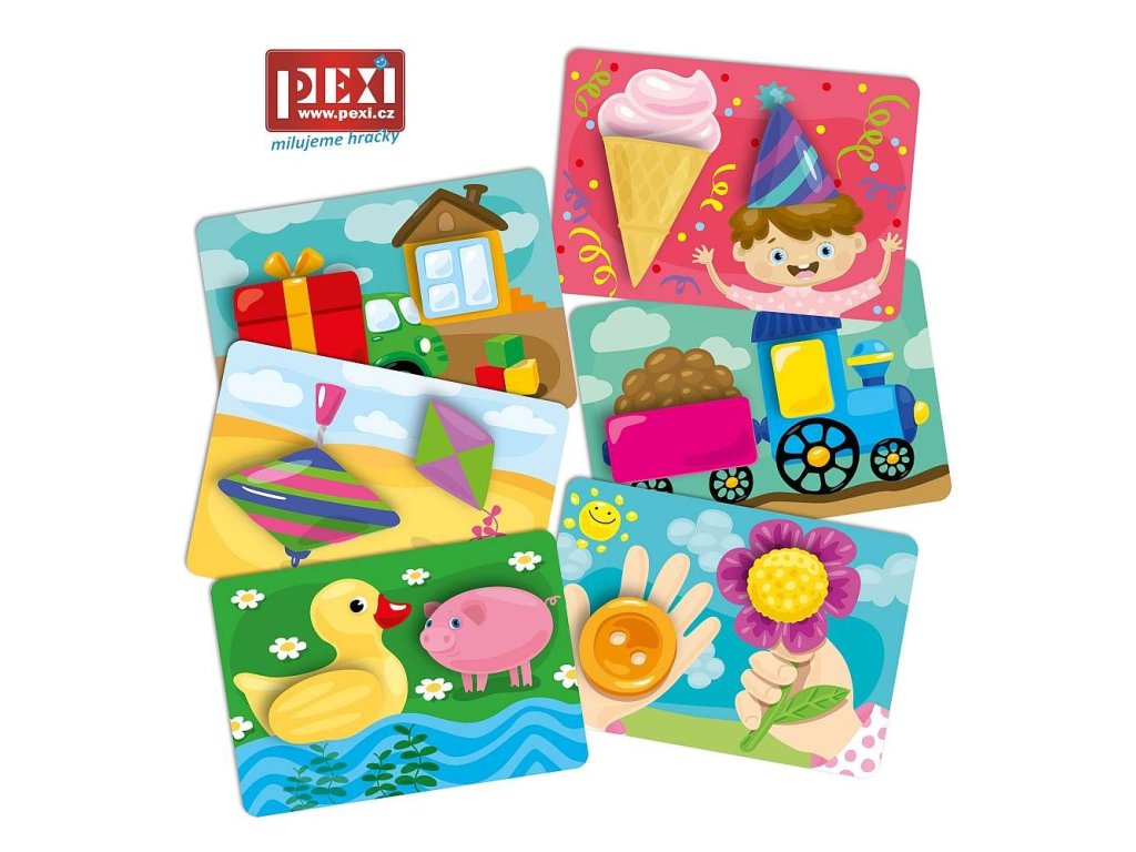 Berte jednotlivé dílky jeden po druhém a povídejte dětem co na nich je.
