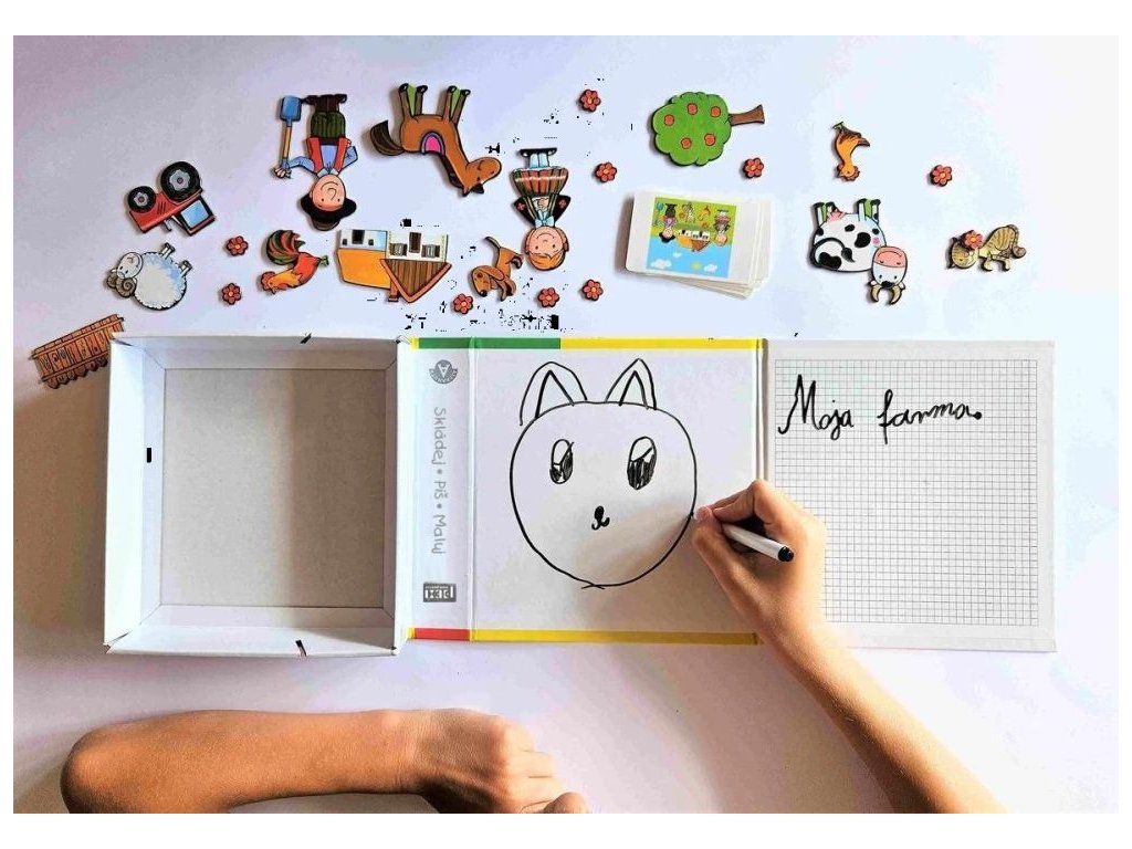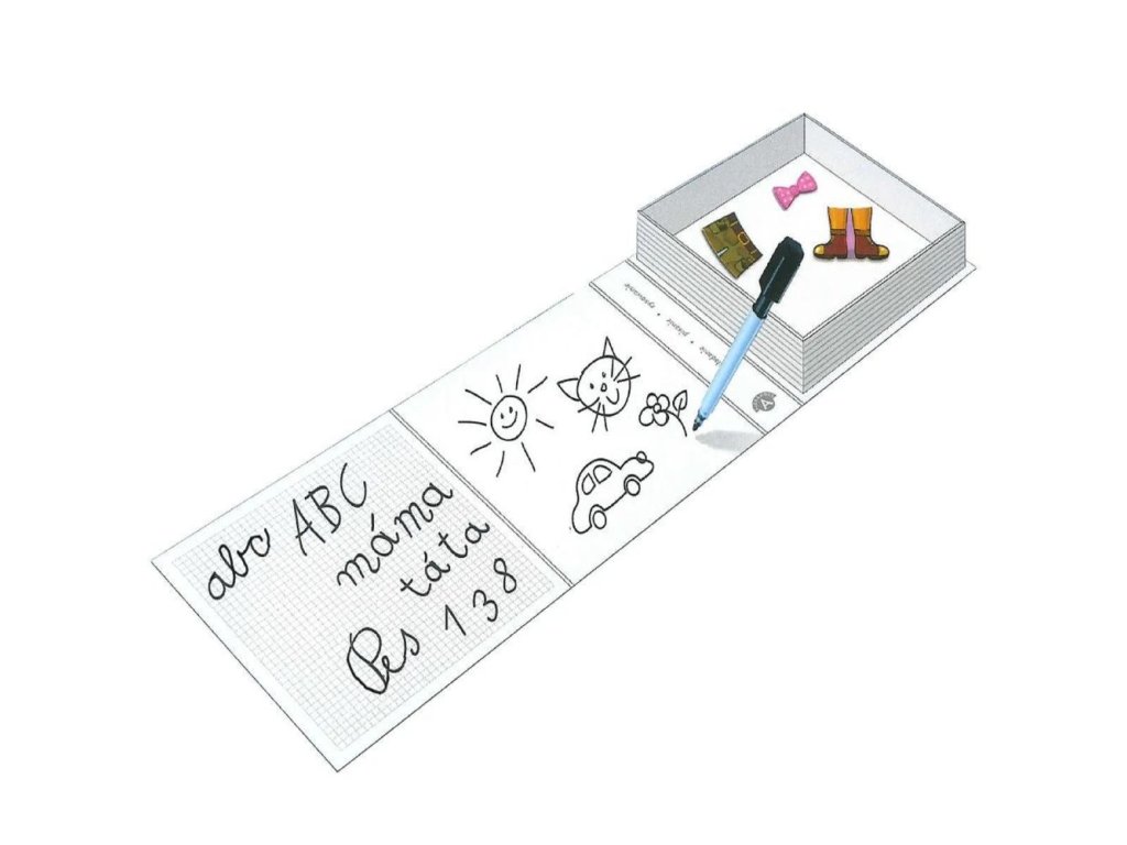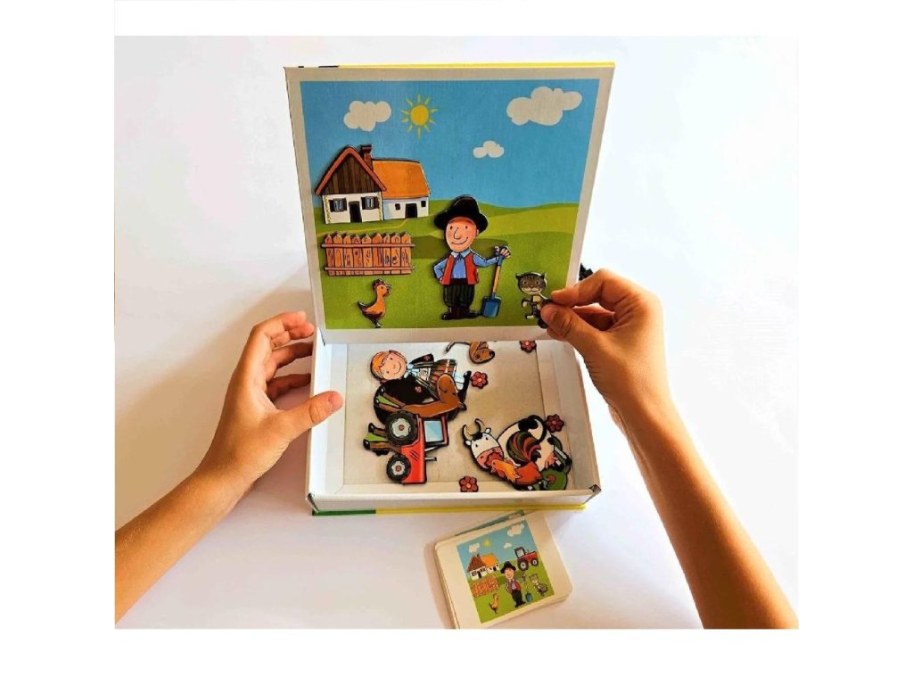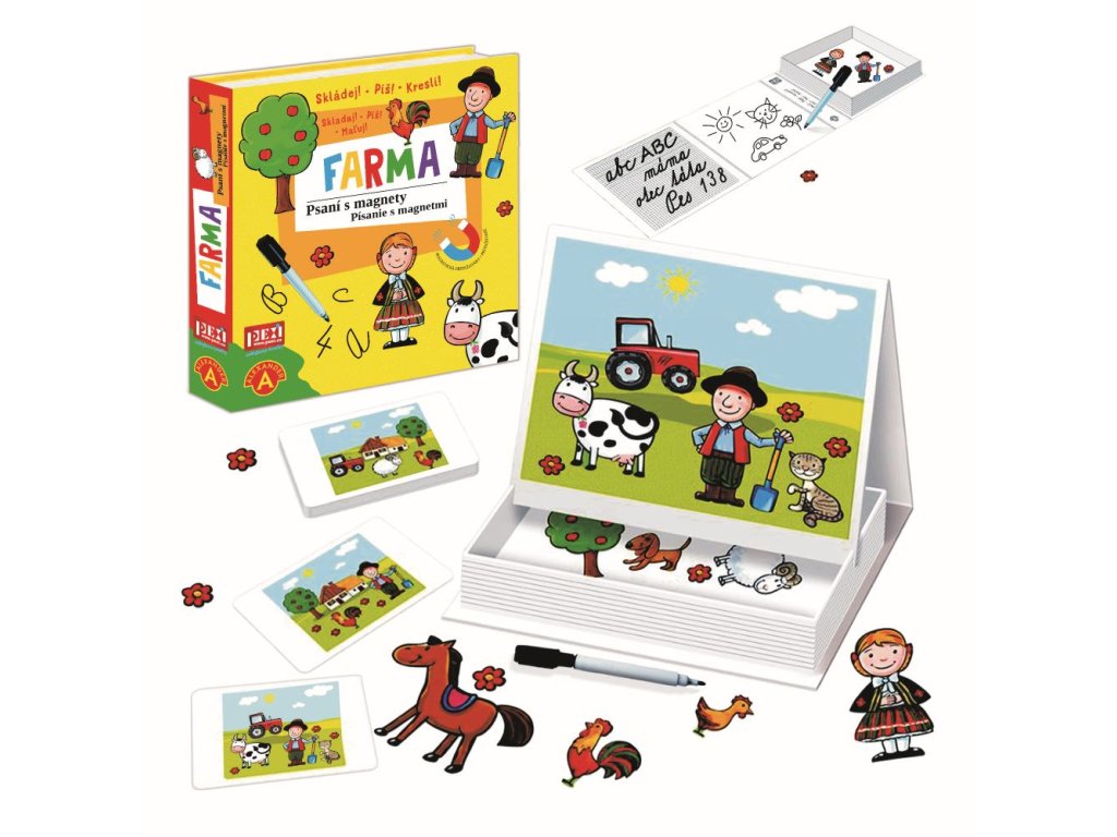 Všestranná hra, která povzbudí děti od 4 do 8 let ke kreativitě, aranžování, kreslení a psaní. Psaní, mazání a skládání magnetických obrázků - vše v jedné sadě. Skvělý trénink psaní písmenek, čísel a spousta volné plochy na malování mazací fixkou a skládání scének z magnetických obrázků... Rozvíjí jemnou motoriku a zručnost, ale také probouzí fantazii a při popisování veselých příběhů zlepšuje vyjadřovací schopnosti a slovní zásobu dětí. Díky magnetům jednotlivé dílky drží na podkladové desce a hra je proto vhodná i na cesty v autě.