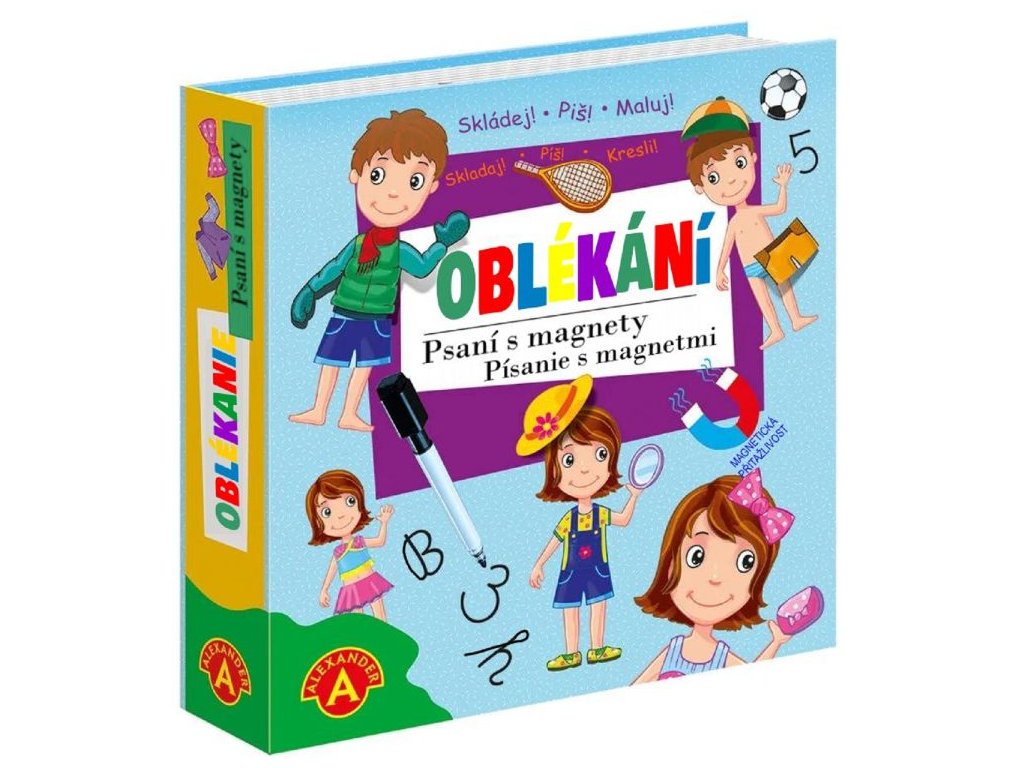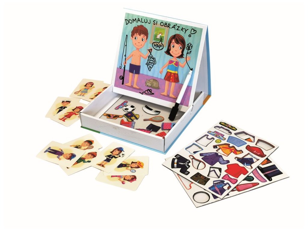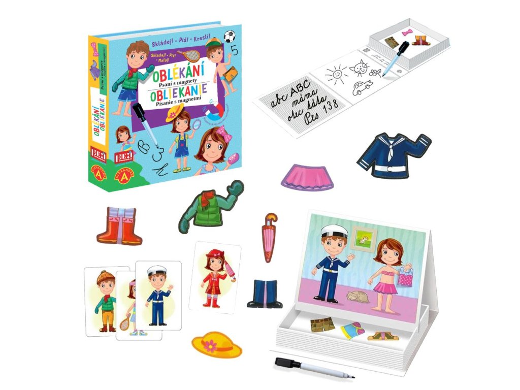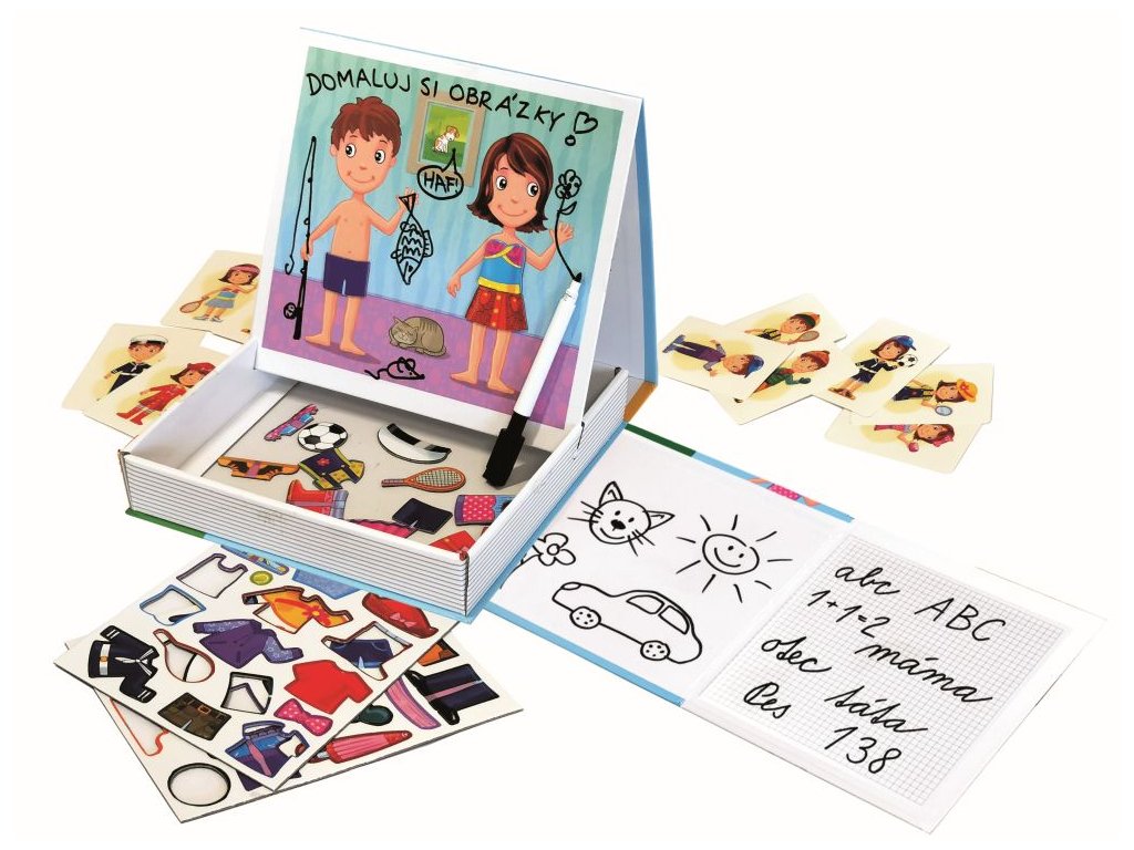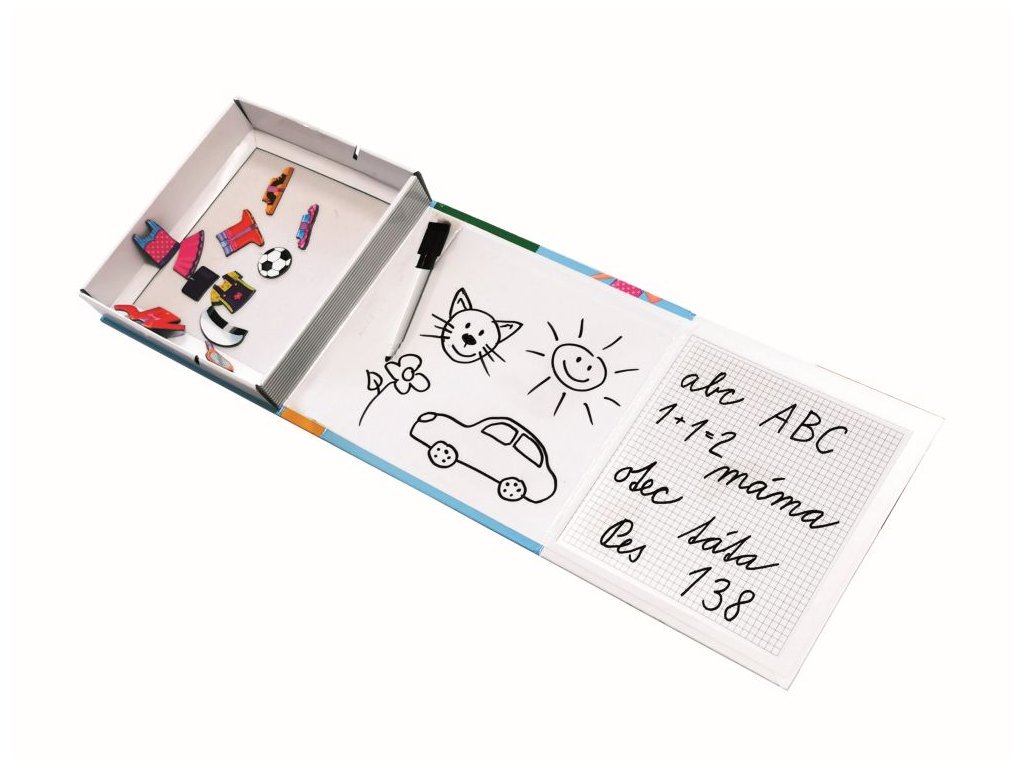 Všestranná hra, která povzbudí děti od 4 do 8 let ke kreativitě, aranžování, kreslení a psaní. Psaní, mazání a skládání magnetických obrázků - vše v jedné sadě. Skvělý trénink psaní písmenek, čísel a spousta volné plochy na malování mazací fixkou a skládání scének z magnetických obrázků... Rozvíjí jemnou motoriku a zručnost, ale také probouzí fantazii a při popisování veselých příběhů zlepšuje vyjadřovací schopnosti a slovní zásobu dětí. Díky magnetům jednotlivé dílky drží na podkladové desce a hra je proto vhodná i na cesty v autě.