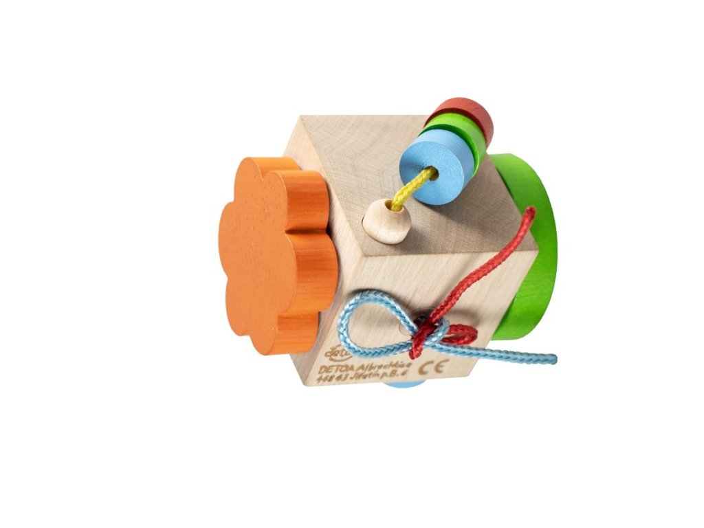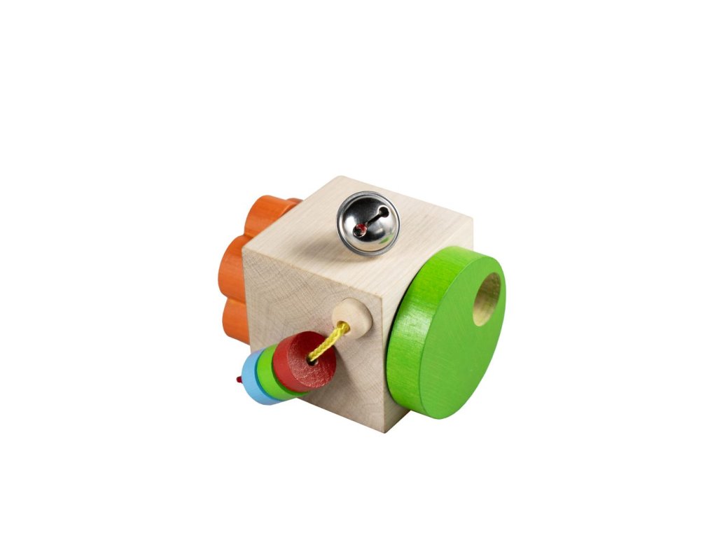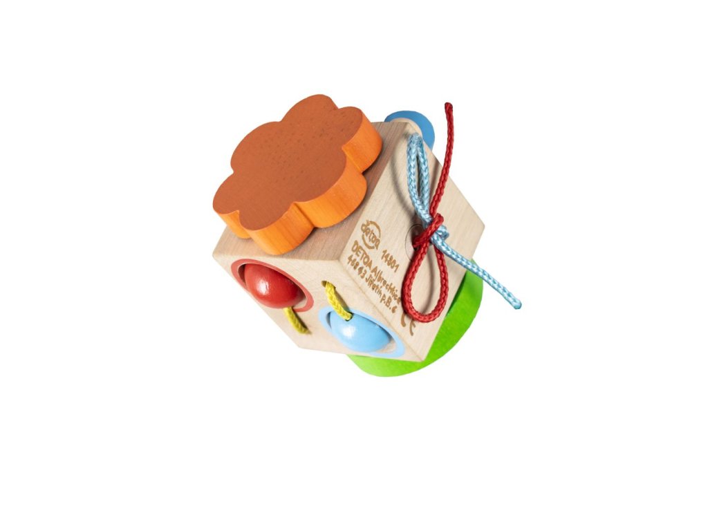Montessori kostka, obasahujíc několik variant drobných činností k procvičení motorických schopností dítěte. Vhodné pro děti od 18m. Velikost hračky 70x70x70mm. Upevněno na paírové kartě