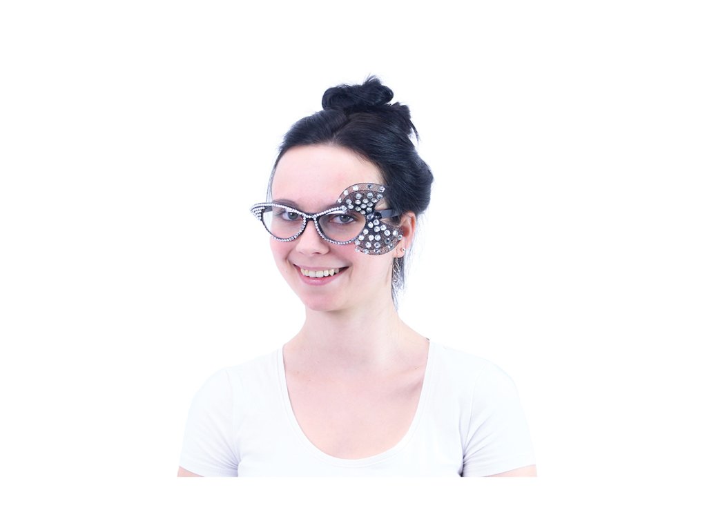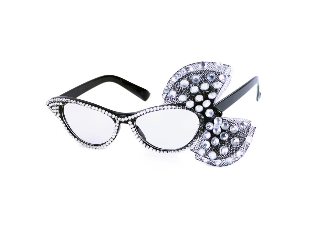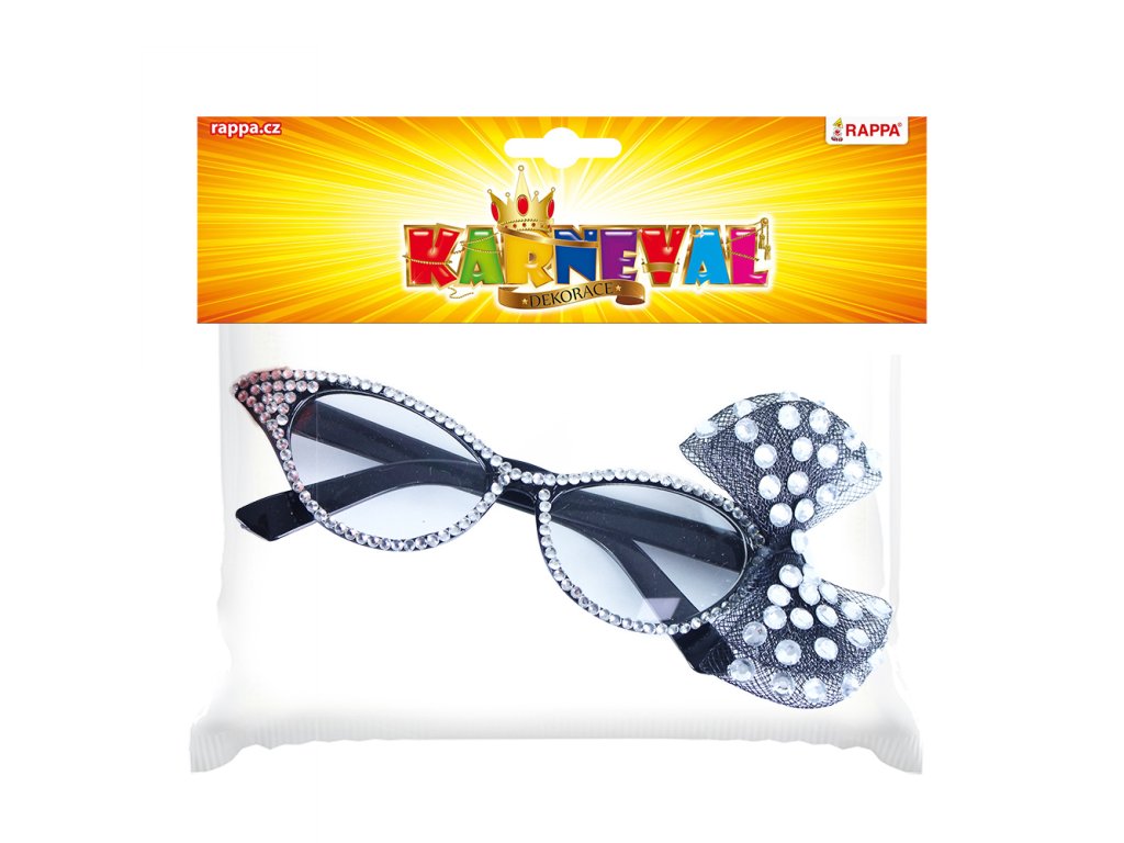 Elegantní karnevalové brýle v černé barvě jsou zdobeny kamínky a mašlí. S tímto doplňkem na očích budete na párty za hvězdu!