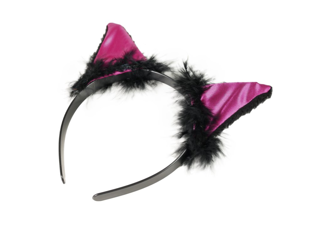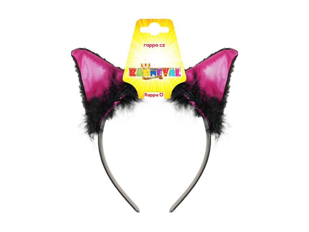Karnevalová čelenka s kočičíma ušima růžovo-černé barvy a peřím je perfektním doplňkem ke kostýmu kočky.