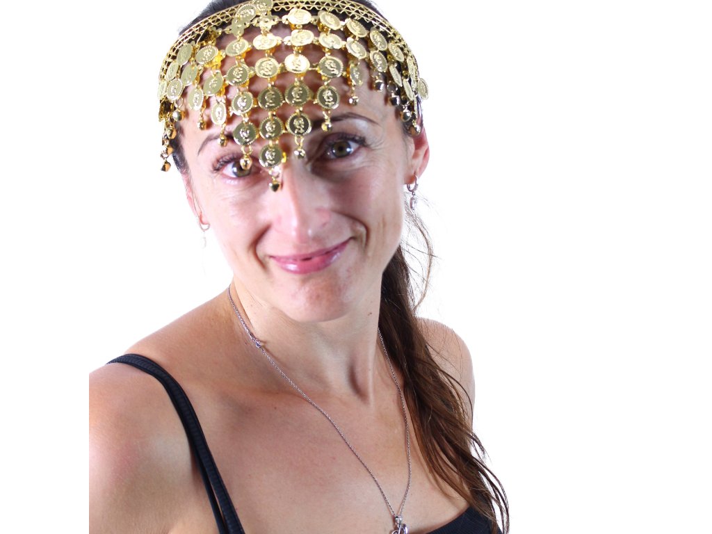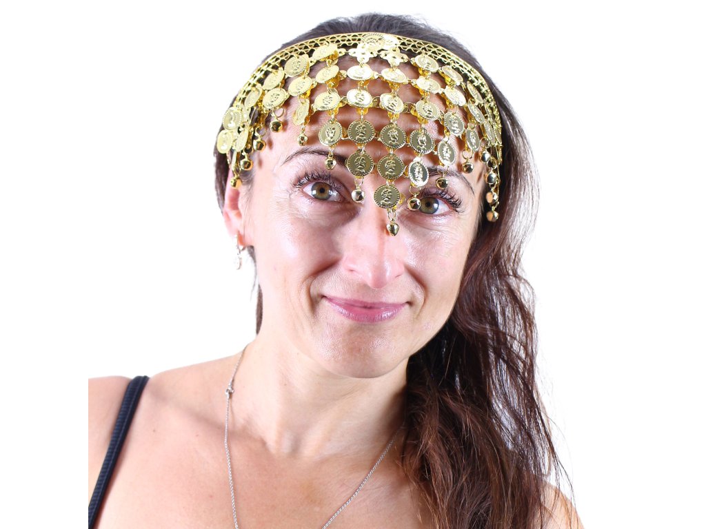 Stylová čelenka se zlatými penízky, vkusně doplní váš karnevalový kostým břišní tanečnice nebo orientální dívky.