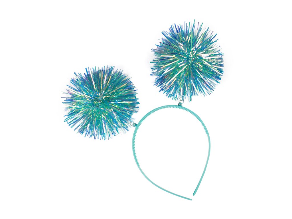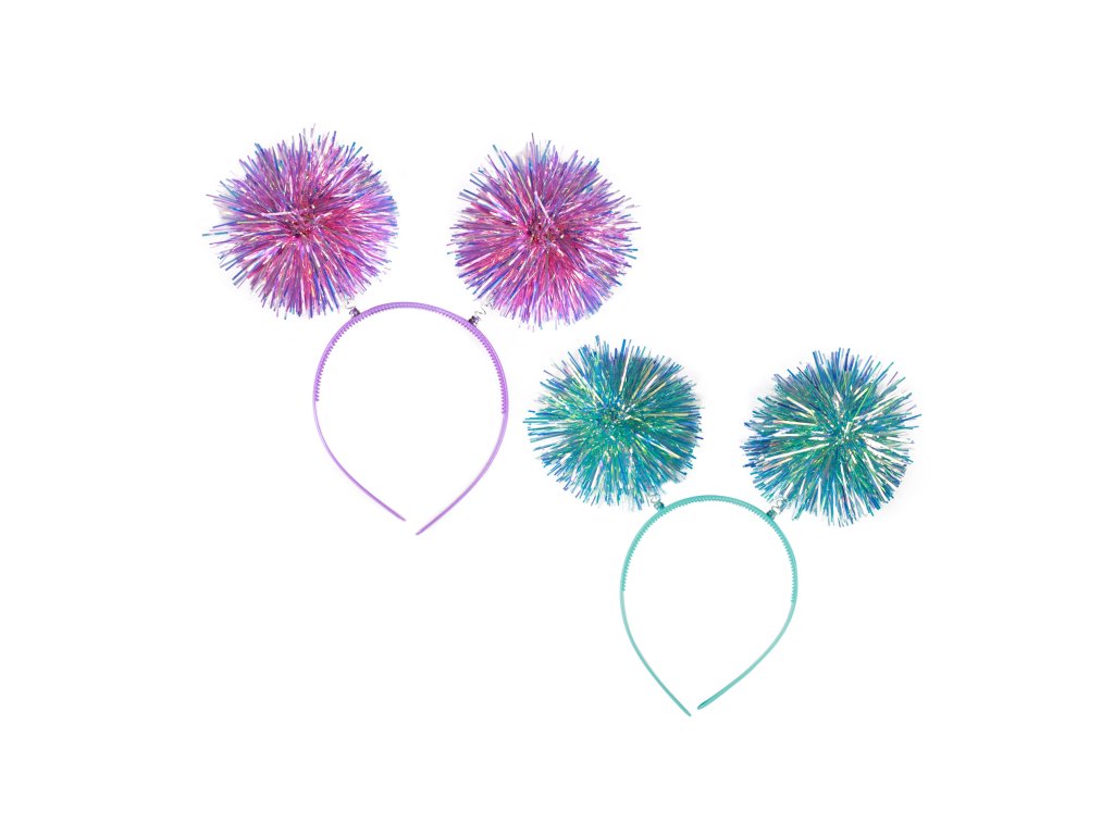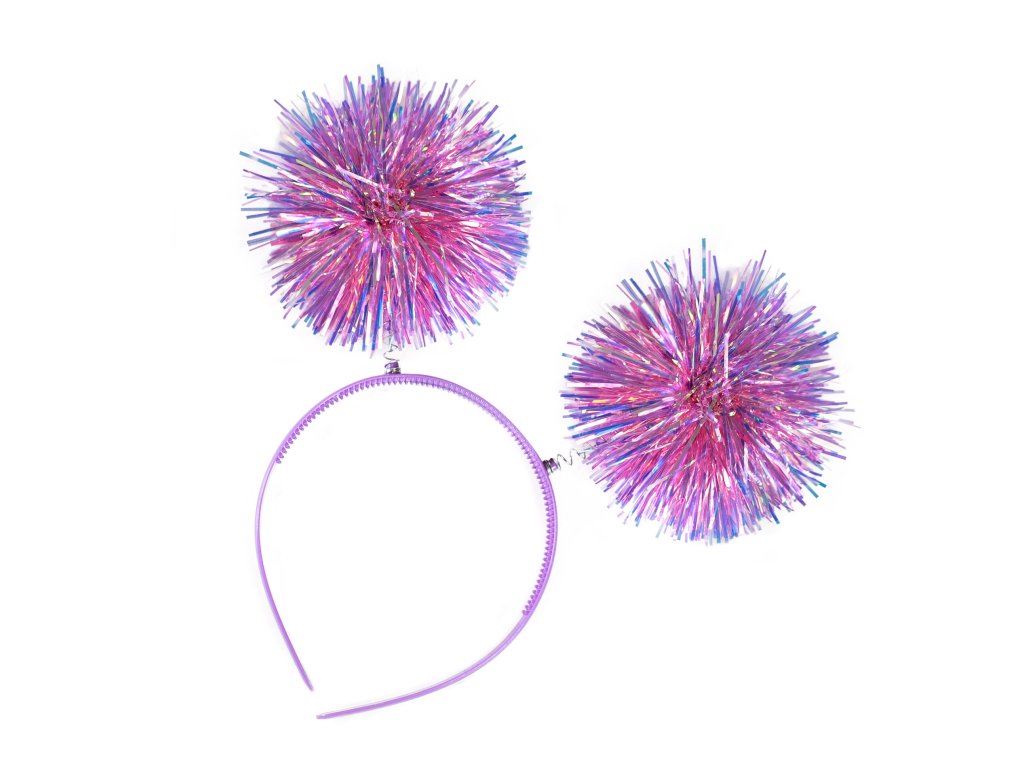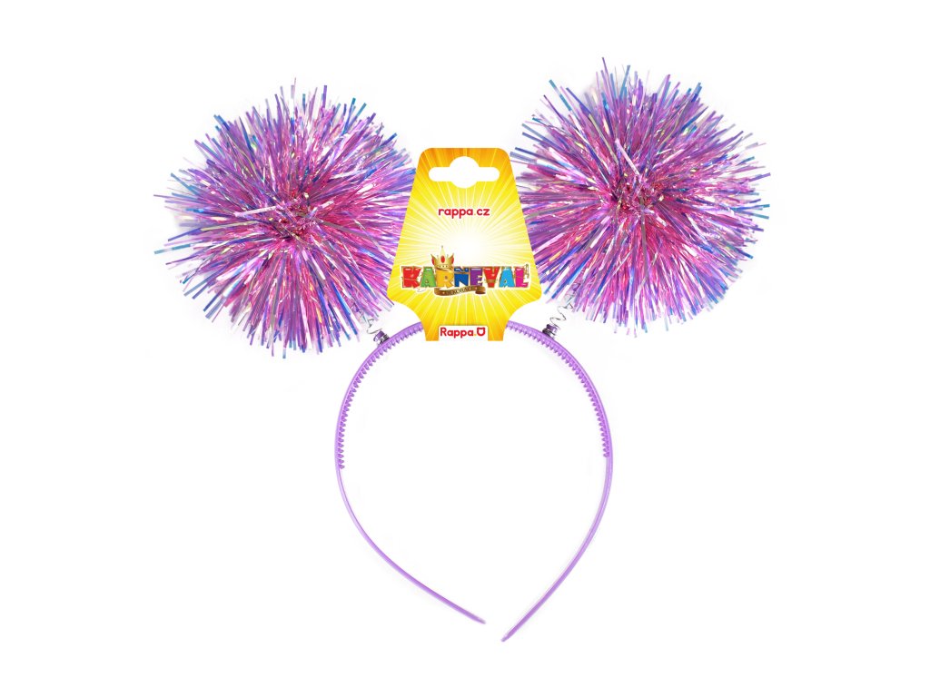 Karnevalová čelenka s třásněmi. Barevná plastová čelenka je zdobená třpytivými třásněmi ve tvaru koulí, které jsou připevněny na pružinkách.
