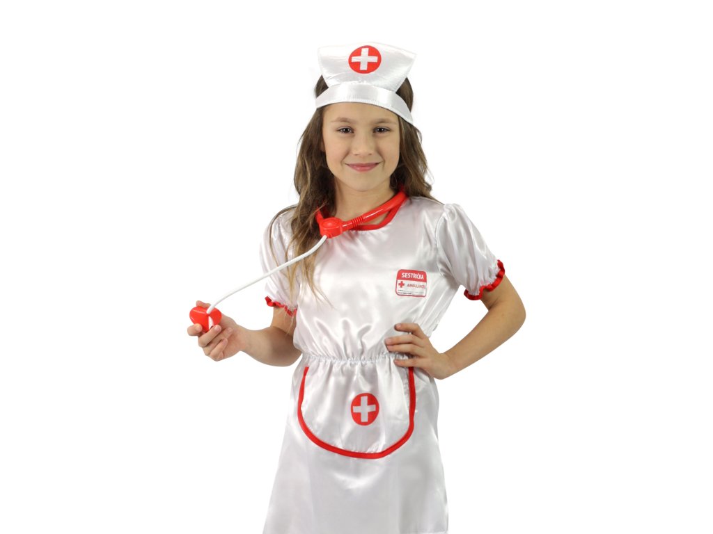 Krásný karnevalový kostým pro malé zdravotní sestřičky. Kostým velikosti S je určen pro děvčata ve věkovém rozmezí 4-6 let (110-116 cm). Sada obsahuje šaty a čepici.