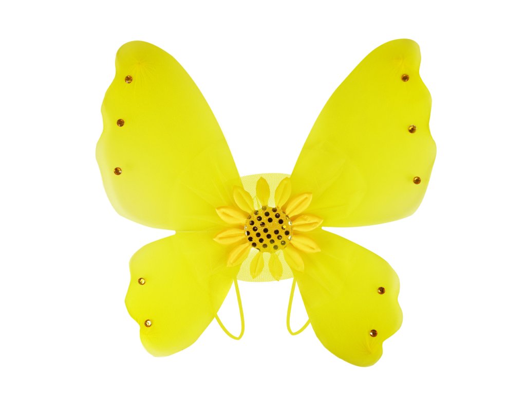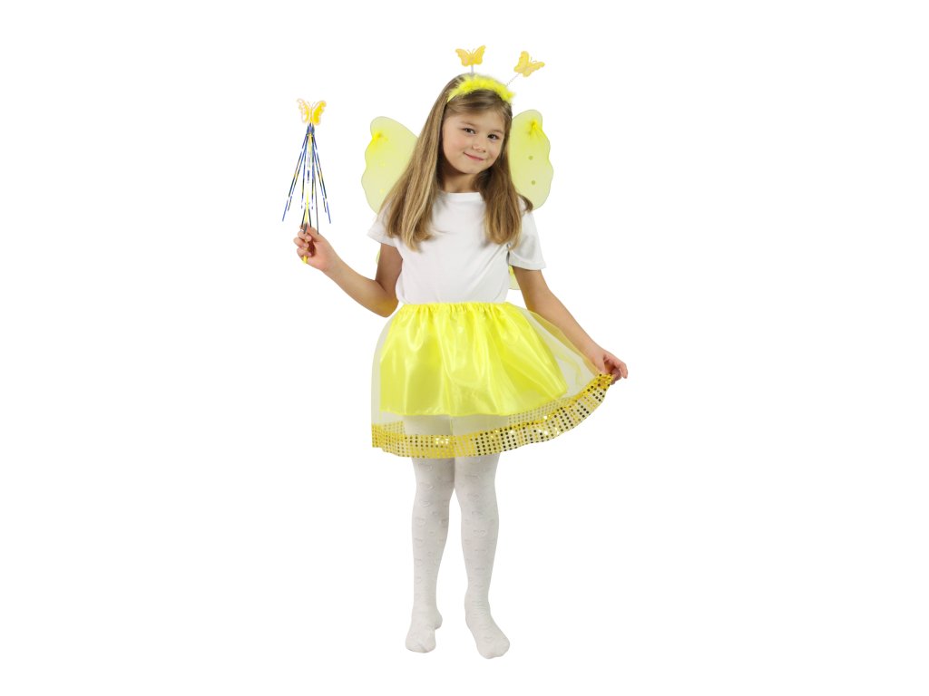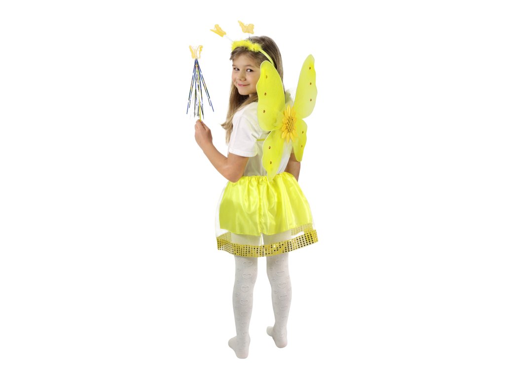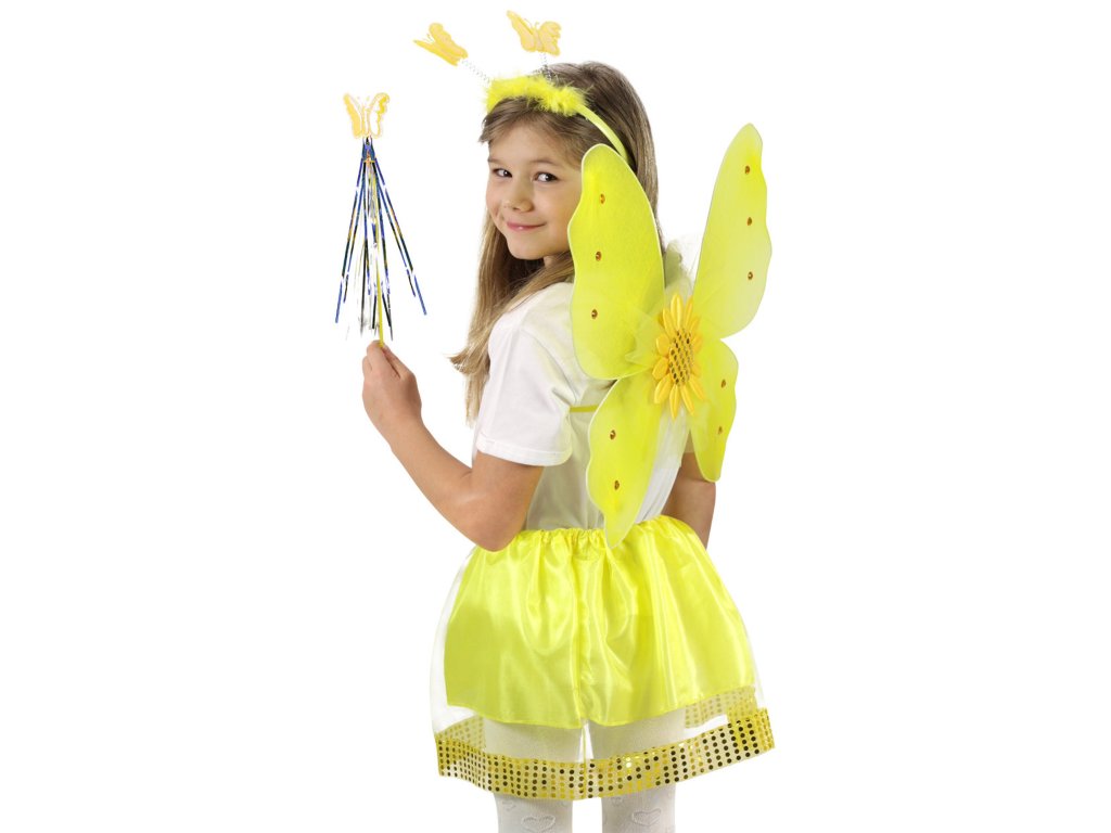 Kostým ve stylu slunečnice pro holčičky na karneval! Kostýmek je určen pro děvčata ve věkovém rozmezí 3-10 let. Balení obsahuje nadýchanou sukýnku, která je ve spodní části lemována zlatými flitry, křídla se slunečnicí a ozdobnými kamínky, čelenku s metalickými motýlky a k tomu sladěnou hůlku.