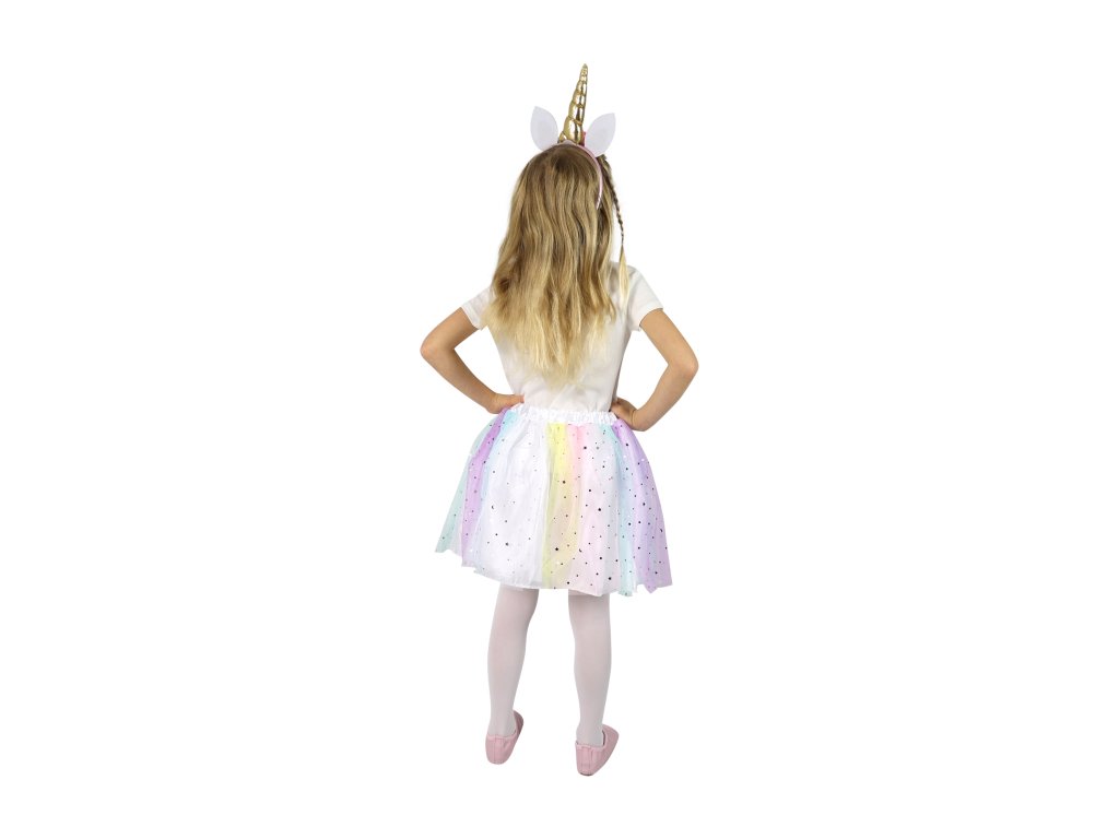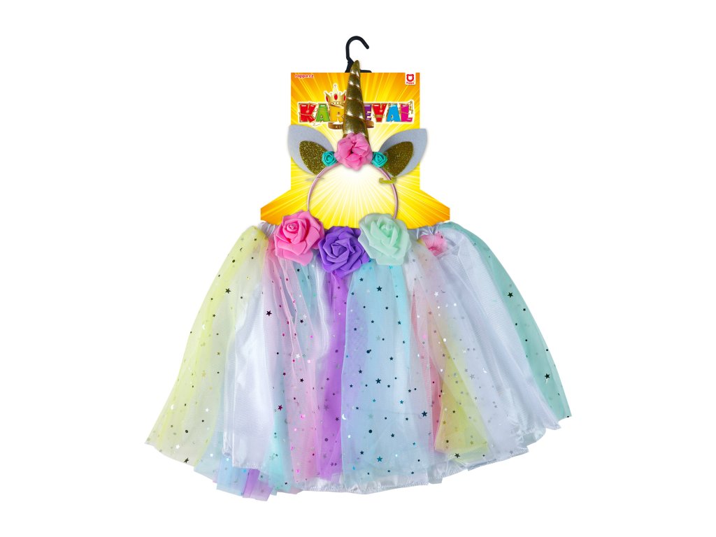 Roztomilá saténová sukýnka TUTU je zdobena barevným tylem s dekorem hvězdiček. Je určena pro holčičky ve věkovém rozmezí 3-10 let (104-146 cm), v pase je na gumu a její délka je cca 26 cm. Součástí této sady je senzační čelenka jednorožce se zlatým rohem a ušima!