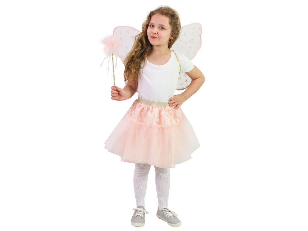 Krásná vílí sada pro malé holčičky! Sada obsahuje růžovou tylovou TUTU sukýnku se saténovou spodničkou. Sukně je zdobena drobnými květinkami a zlatou gumou v pase, k tomu perfektně sladěná křídla a hůlka ve stejném motivu. Sukně je dlouhá cca 35 cm a je vhodná pro obvod pasu 50-60 cm. Určeno pro holčičky ve věkovém rozmezí 3-10 let (104-146 cm).