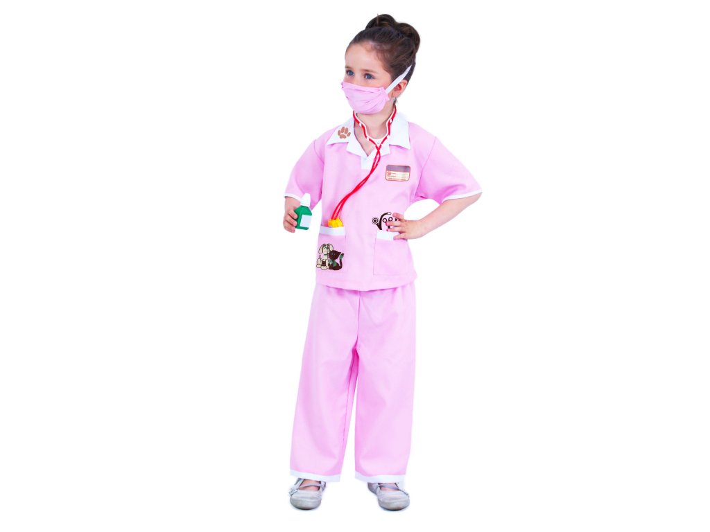 Úžasný kostým pro malé veterinářky! Kostým ve velikosti S je určen pro holčičky ve věkovém rozmezí 4-6 let (105-116 cm). Sada obsahuje blůzu s kalhotami v růžové barvě se stylovým zvířecím potiskem. Součástí balení je také rouška. Nejen letos je potřeba myslet EKO-nomicky i EKO-logicky! EKO-balení je vhodné zejména pro e-shopy kde zákazník nakupuje dle fotografie a není třeba velkého balení s věšákem. EKO-logicky – na balení bylo použito méně plastu a dalších materiálů. Jedná se o malý transparentní obal s fotografií. EKO-nomicky –EKO-obal zabere jen polovinu místa – šetřete skladová místa s námi!