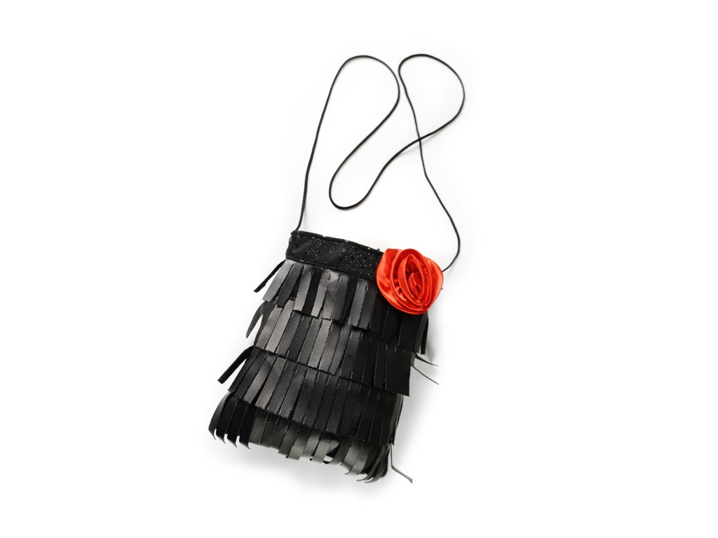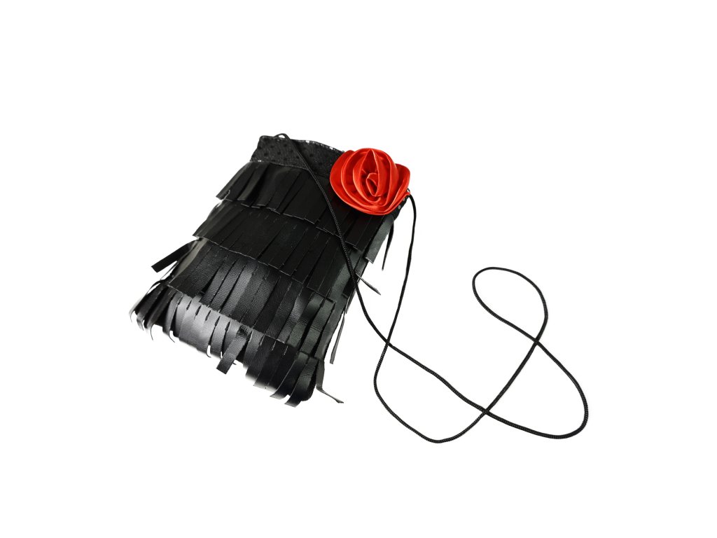 Stylová černá taška zdobená rudou saténovou růží. Taška má rozměr 15 x 21 cm, délka ucha cca 55 cm. Perfektní doplněk na párty!