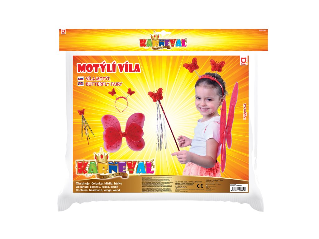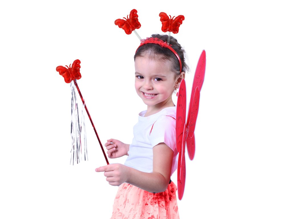 Roztomilá červená motýlí křidélka na gumičku jsou určena pro holčičky ve věkovém rozmezí 3-10 let (104-150 cm). Součástí této karnevalové sady je také čelenka s motýlky na pružinkách a hůlka.