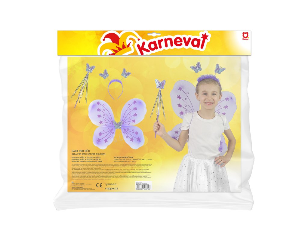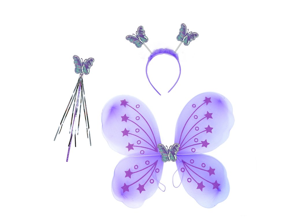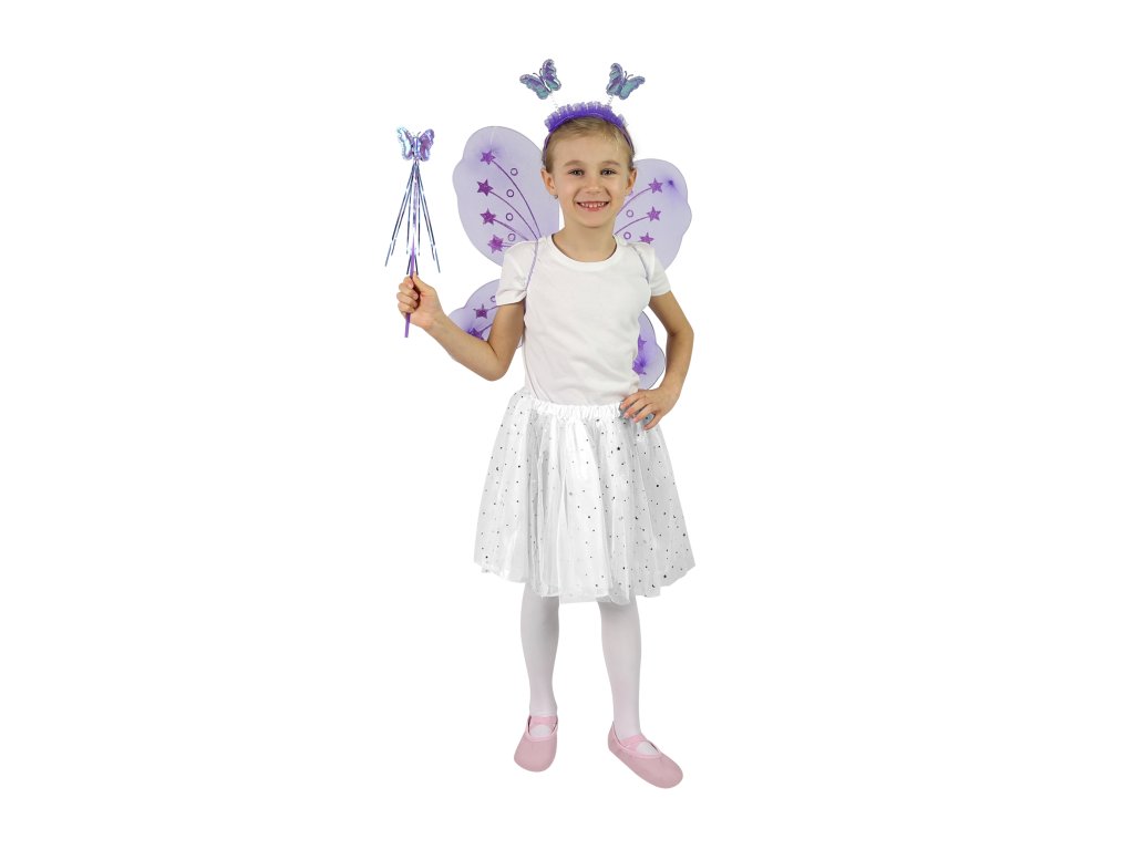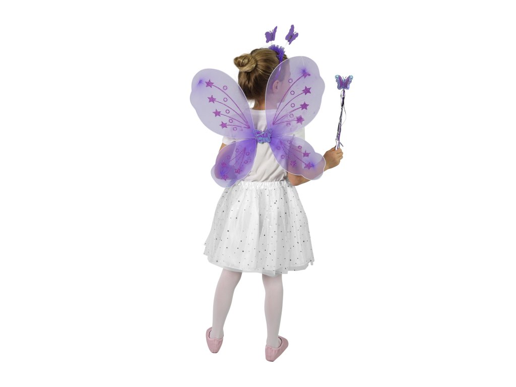 Roztomilá fialová motýlí křidélka na gumičku jsou určena pro holčičky ve věkovém rozmezí 3-10 let (104-150 cm). Součástí této karnevalové sady je také čelenka s motýlky na pružinkách a hůlka.