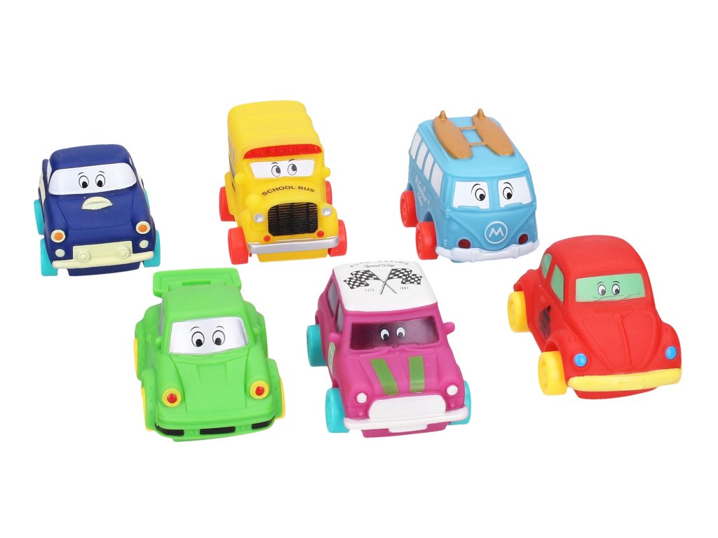 Auto soft. Velikost 9 cm. Volná kola. 12 ks display box. 6 variant - brouk, trabant, sporťák, mini, autobus, dodávka.