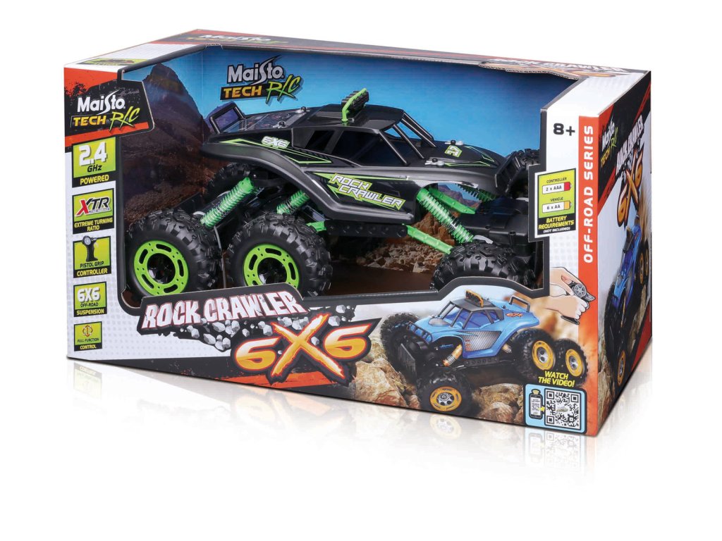Rock Crawler 6x6. Dálkově ovládaný špičkový RC model + mohutné terénní pneumatiky. Frekvence 2,4 GHz. Délka modelu cca 43 cm. Auto funguje na 6xAA baterie a ovladač na 2xAAA baterie (nejsou součástí). Rozměry balení: 50,8x27,3x26,7cm. Nevhodné pro děti do 3 let. Věk: 8+