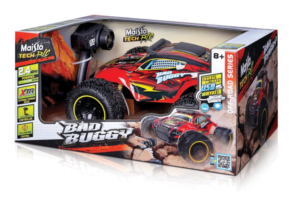 Maisto Tech RC Bad Buggy. Plastový model značky Maisto na dálkové ovládání. Auto má dokonalou konstrukci, mohutné terénní pneumatiky a skvělé vlastnosti při jízdě v terénu. Dosah ovládání až 35 m. Rychlost: 17,3 km/h. Doba jízdy: 12 minut. Možnost ovládaní díky frekvenci 2,4 GHz až pro 4 RC modely. Nastavení vyrovnání řízení. Ovladač v profesionálním stylu s proporcionální regulací rychlosti. Auto funguje na lithiovou dobíjecí baterii 6,4V, kterou jednoduše dobijete pomocí USB kabelu. Ovladač funguje na 2x AA baterie. Baterie i dobíjecí kabel jsou součástí balení. Délka modelu cca 38 cm, šířka modelu cca 36 cm. Baleno v krabičce. Rozměr balení: 24,6 x 50,5 x 40,3 cm. Věk: 8+