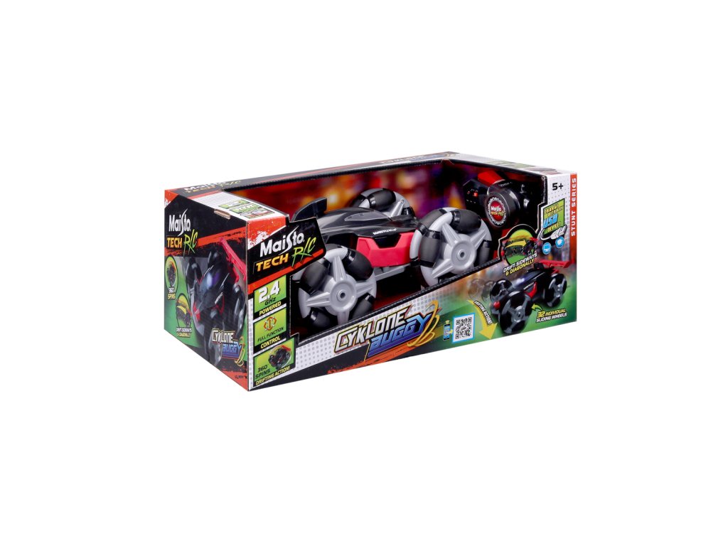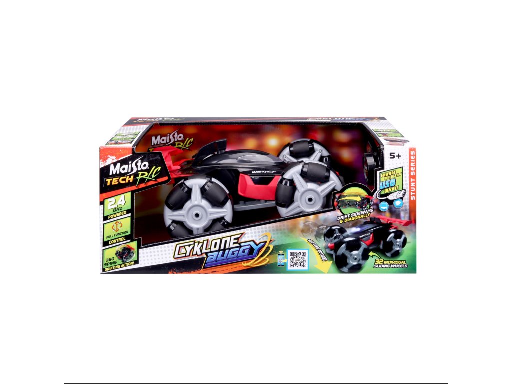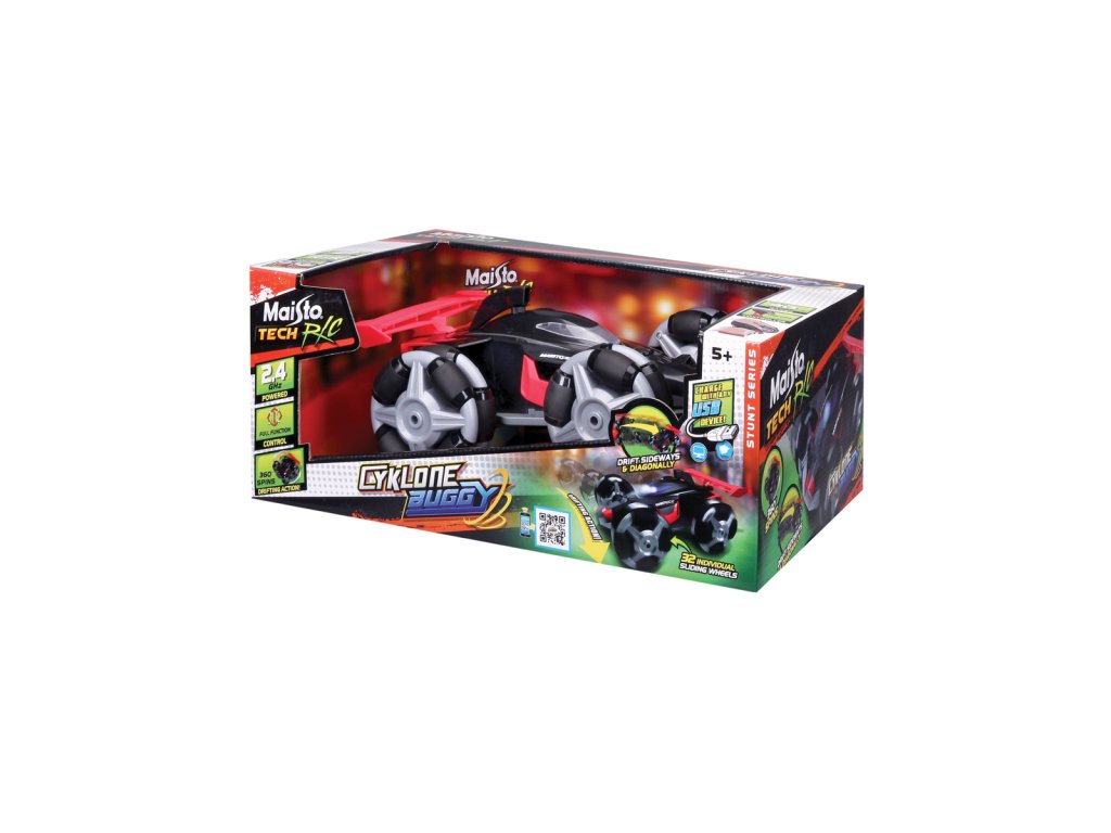 Cyklone Buggy, černá barva. Plastový model značky Maisto na dálkové ovládání. S tímto modelem driftování nikdy nebylo snažší, díky jedinečnému designu kol s válečky, které pomáhají driftovat bez námahy. Auto využívá dobíjecí baterii pomocí USB kabelu (oboje součástí balení). Dálkový ovladač má dosah až 35 metrů. Ovladač používá 2x AAA baterie (součástí balení). Rozměr balení: 38,1x15,24x22,85 cm. Věk 5+
