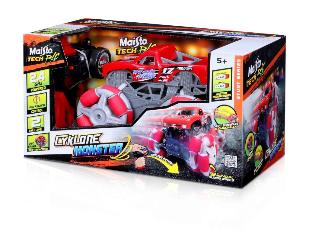 Cyklone Monster. Model sportovního vozu na dálkové ovládání od značky Maisto. Auto má unikátní kola, která se skládají z celkem 32 otočných válečků. Auto jezdí na 4xAAA a ovladač je na 2xAAA baterie, které nejsou součástí balení. Dosah ovladače až 35m. Balení: 28x15,2x15,2cm. Věk: 5+