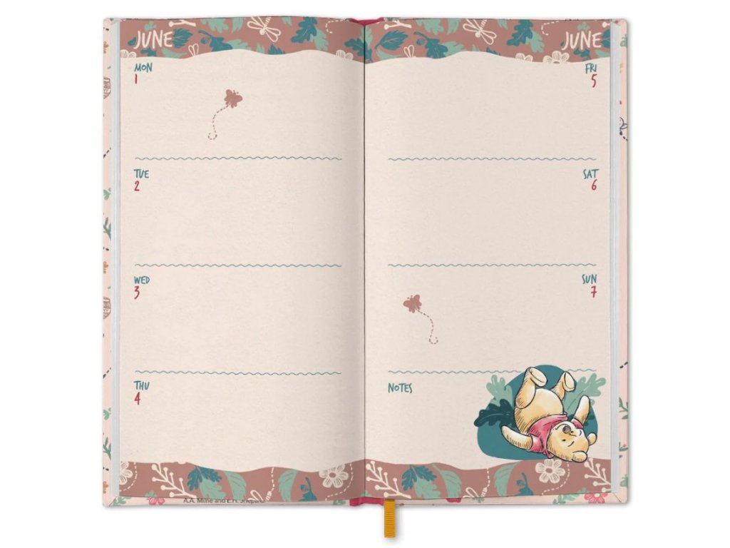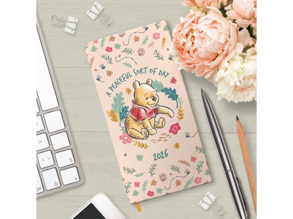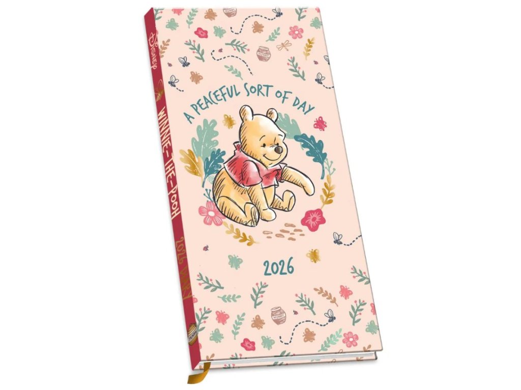 Oficiální produkt - slim diář na rok 2026 s licencí a grafikou knižní a filmové postavičky Medvídka Pú.