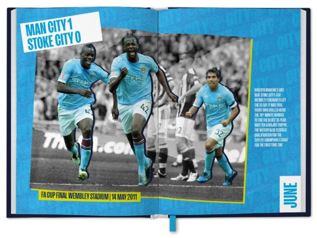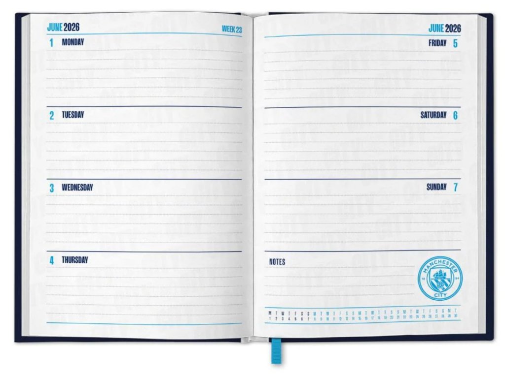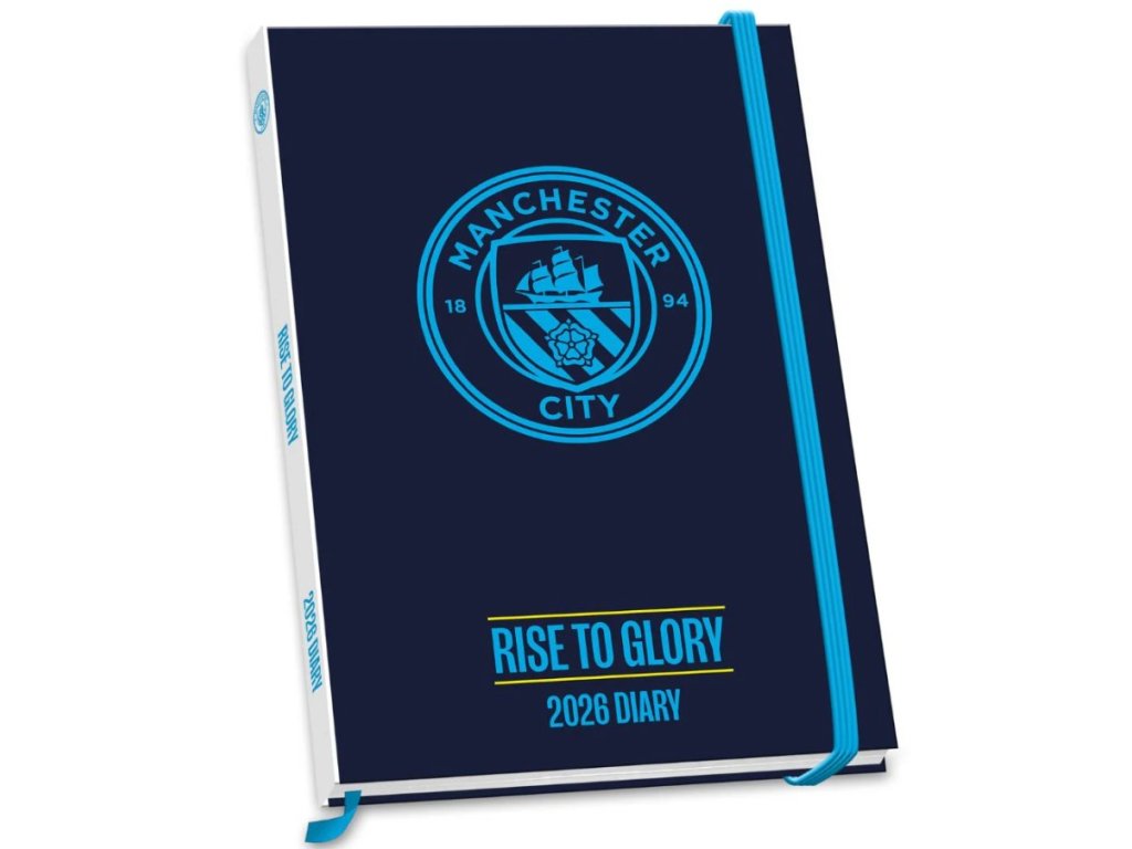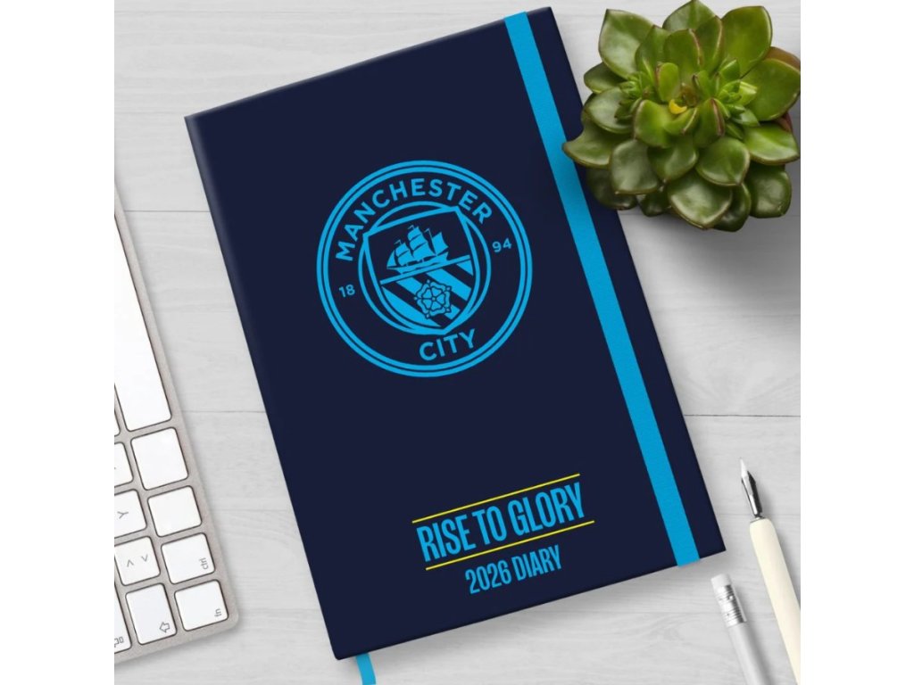 Celoroční praktický plánovací A5 diář s grafikou a fotografiemi hráčů fotbalového klubu FC Manchester City.