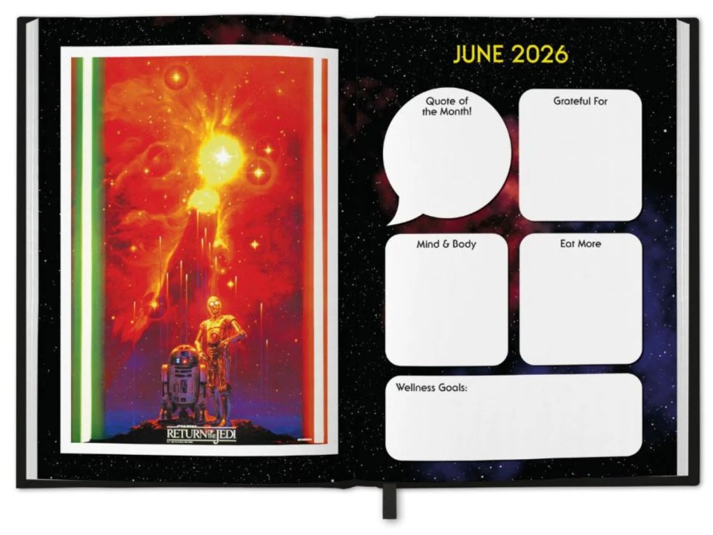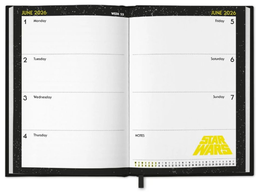 Celoroční praktický plánovací A5 diář s obrázky a grafikou filmové ságy Star Wars.