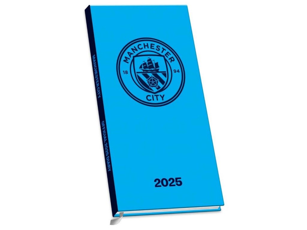 Oficiální produkt - slim diář na rok 2025 s licencí a grafikou britského fotbalového klubu FC Manchester City.