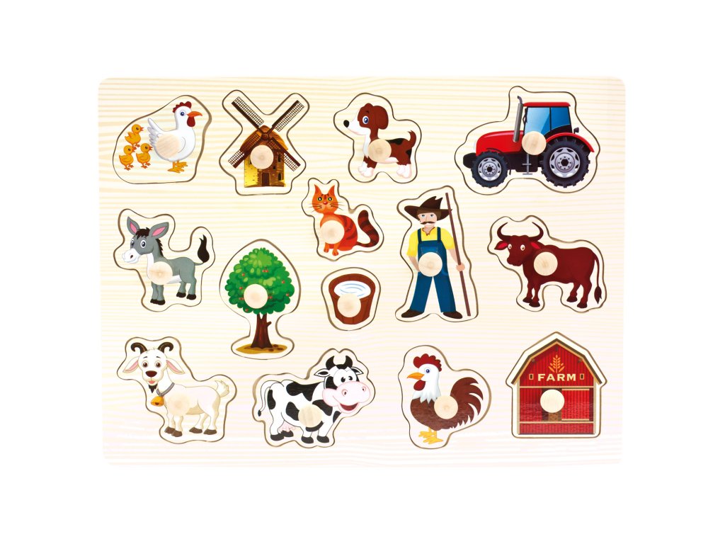 Velké puzzle na dřevěné desce s vyndavacími obrázky nám přináší život na venkově a všechny zvířecí pomocníky. Hra rozvíjí dětskou motoriku.