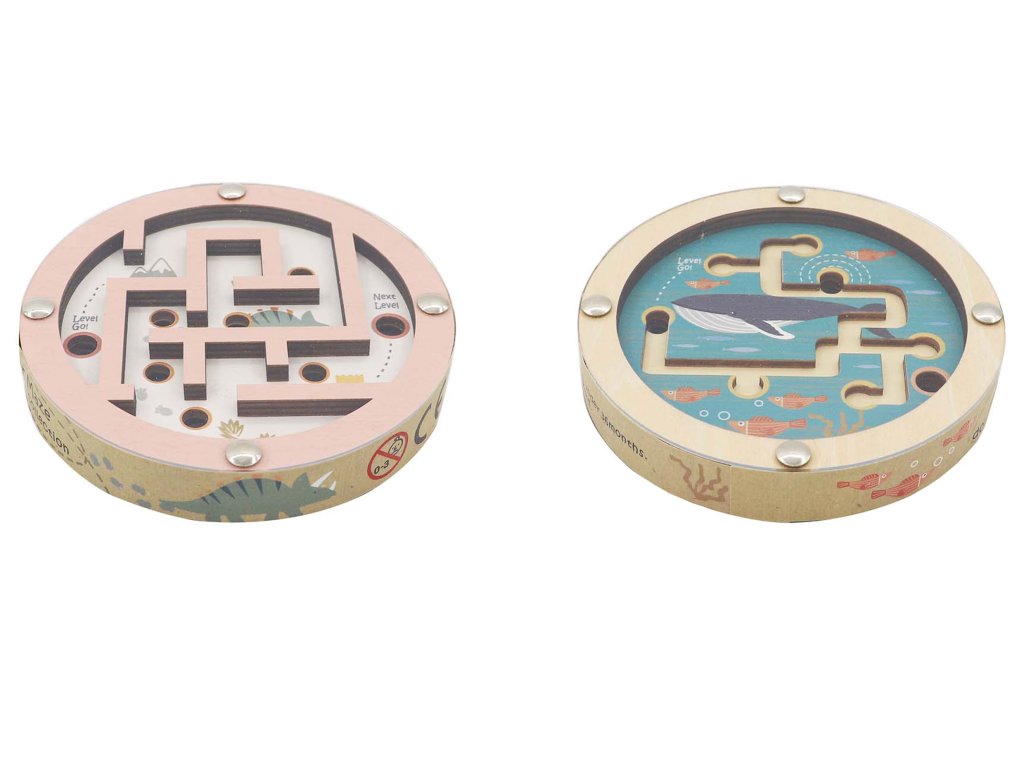 Kuličková hra oboustranná dřevěná. Rozměry 11x11x2 cm. 8 ks display box. 2 varianty - moře, dinosauři.