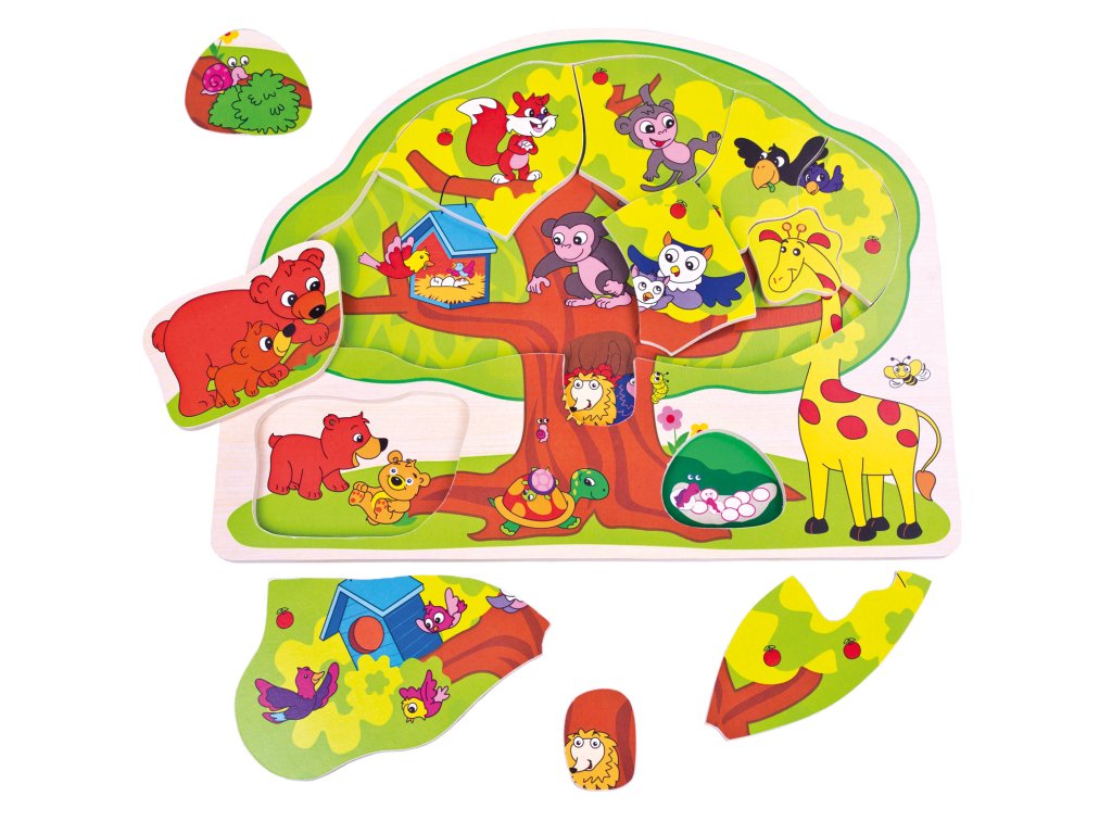 Dětská vkládačka ze dřeva, ve tvaru ovocného stromu s veselými obrázky zvířátek.