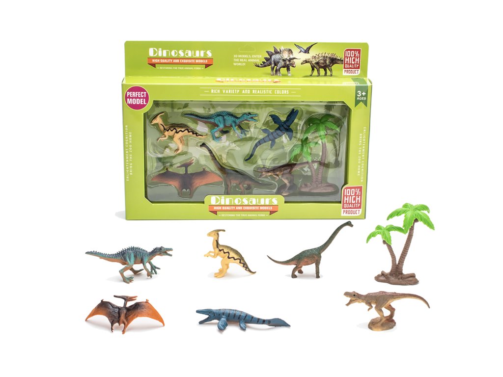 Dinosauři figurky set 7 ks. Přesné rozměry 9x5x1 cm. Obsah balení - 6 dinosaurů, 1x palma. 2 varianty