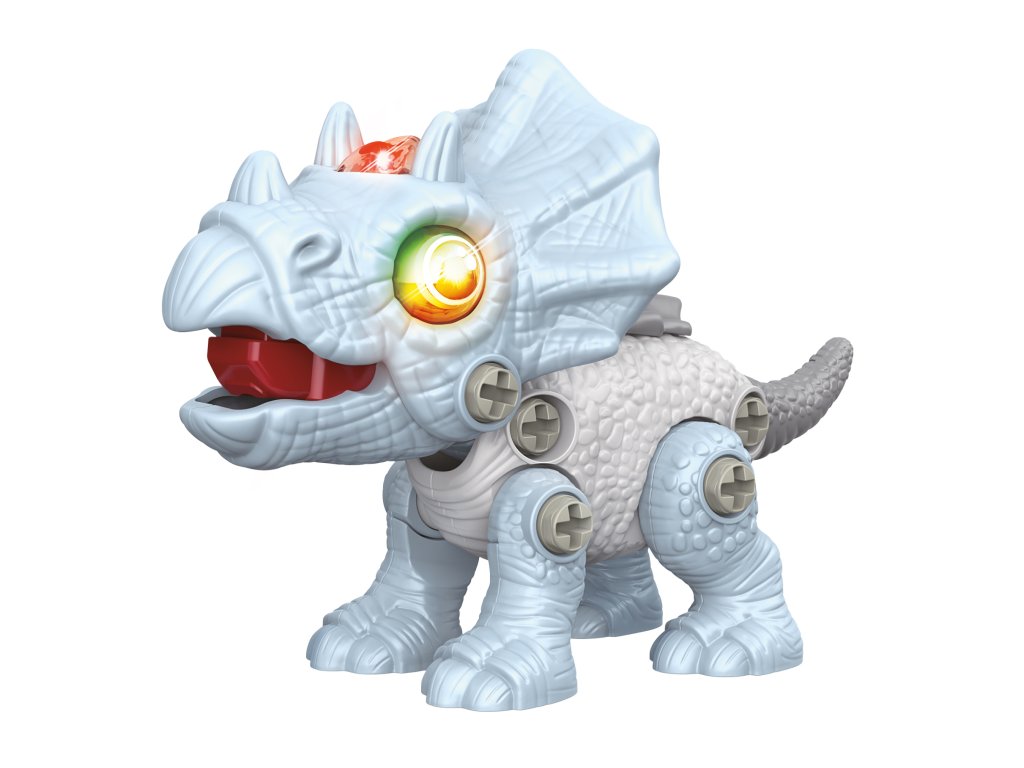 Dino šroubovací s efekty triceratops. Rozměry 13,5x7x10 cm. Dinosaurus po zmáčknutí hřebínku na hlavě otevírá tlamu a koulí očima, při přidržení svítí. Otevření tlamy také aktivuje efekty. Vydává zvuky. 2xAG13 baterie jsou součástí balení. Balení obsahuje dinosaura a šroubovák.