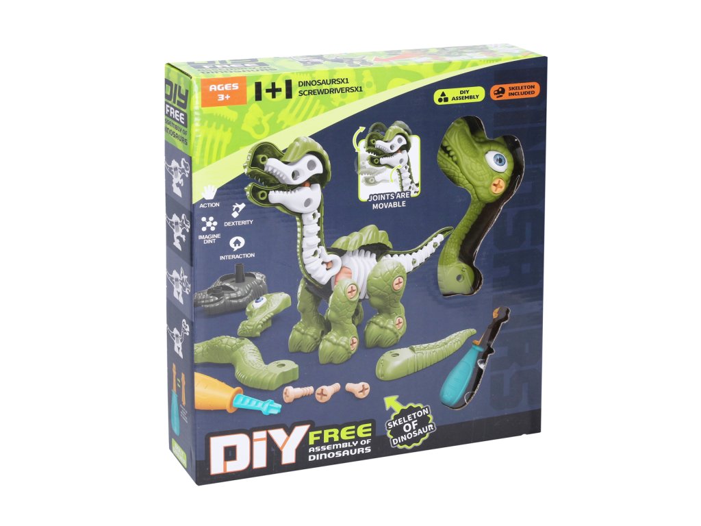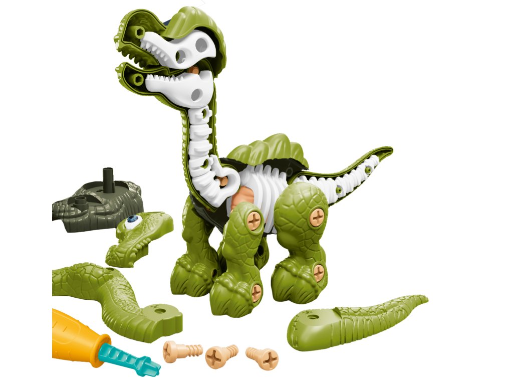 Dinosaurus s kostrou šroubovací. Obsahuje: dinosaurus, šroubovák, náhradní koncovka šroubováku a a šroubky.