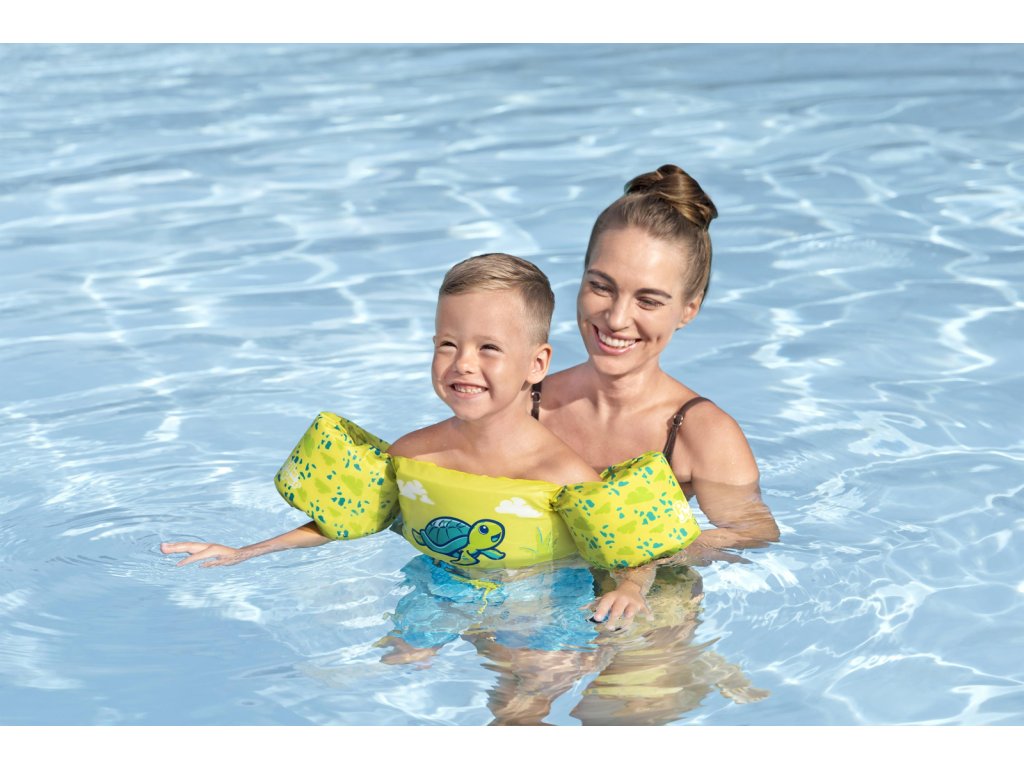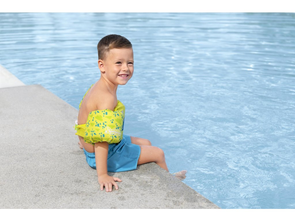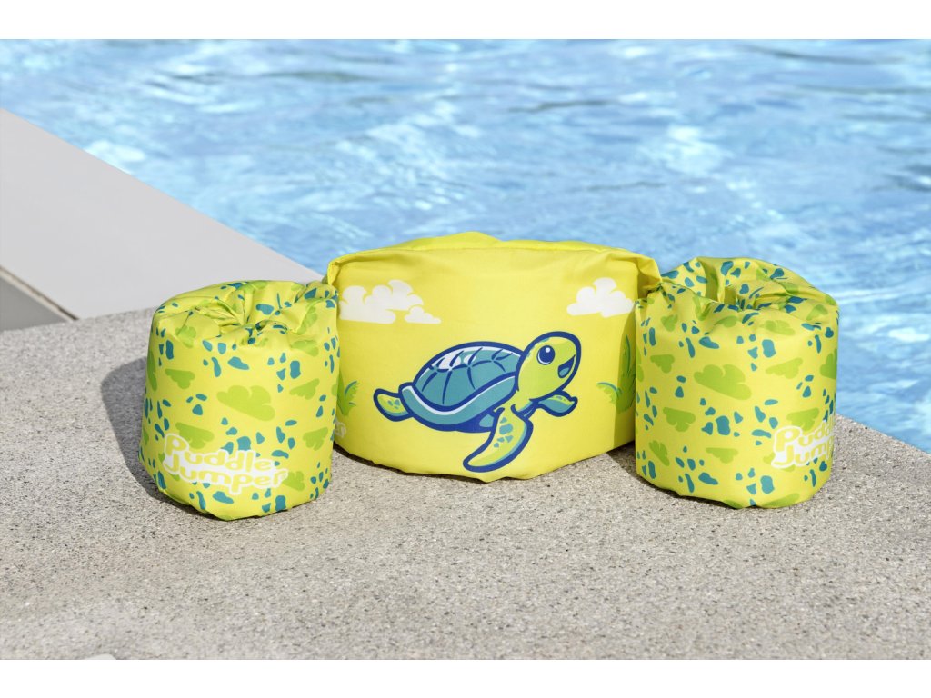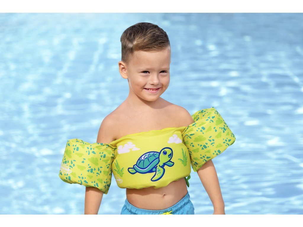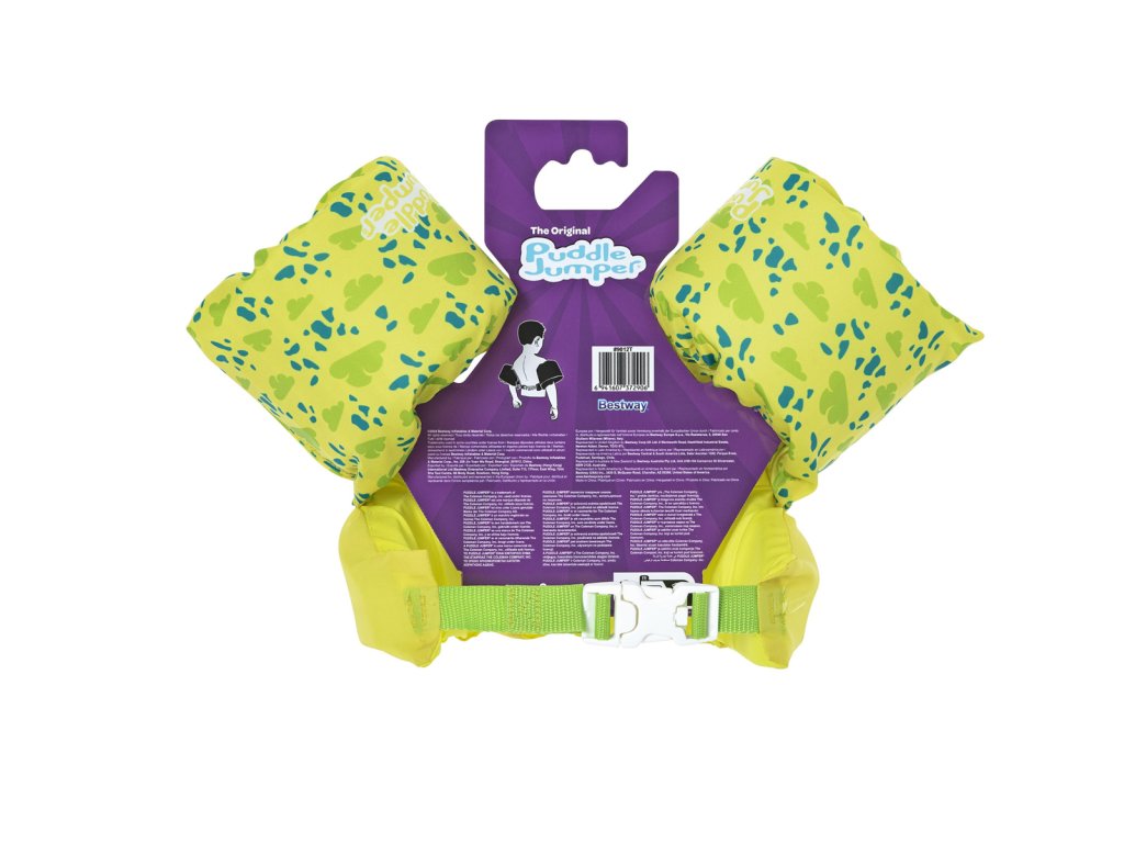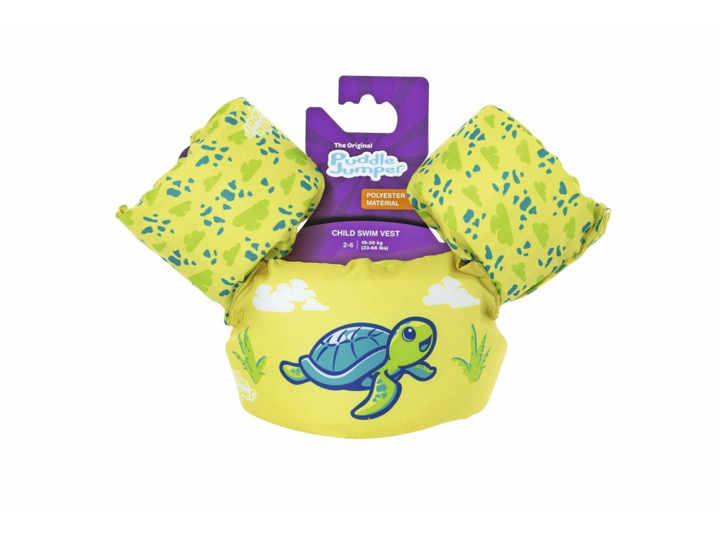Bestway® Puddle Jumper® Dětská plovací vesta s želvím motivem. Plavecká pomůcka pomáhá malým dětem ve věku od 2 do 6 let naučit se základům plavání a získat bezpečnost v bazénu. Inovativní design záchranné vesty a vodních křidélek zajišťuje, že děti zůstanou bezpečně na vodní hladině. Textilní potah je vyroben z hladkého, pevného a pohodlného polyesterového materiálu. Vesta má také integrované pěnové polstrování a nastavitelný popruh se zapínáním. Naučit se plavat nikdy nebylo tak zábavné a bezpečné. Obvod hrudníku: 56 cm. Maximální nosnost: 15-30 kg. Rozměry balení: 46 x 38 x 12 cm. Používejte pouze pod dohledem dospělé osoby. Věk: 2+