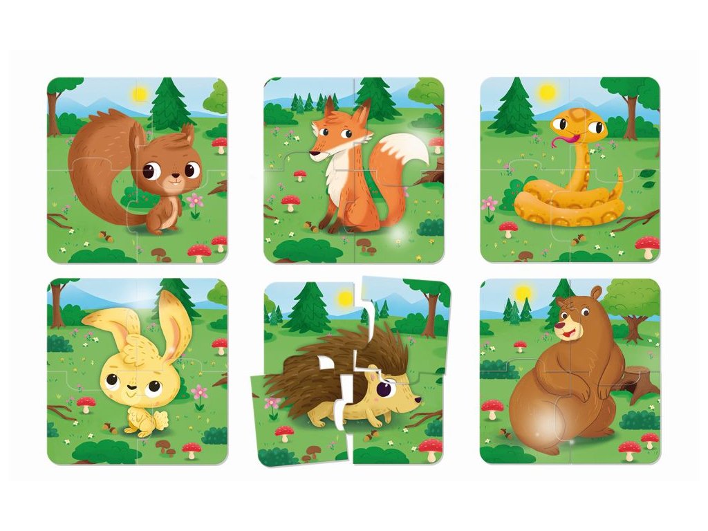 Spousta zábavných hlavolamů s přáteli z lesa. Rozvíjejte pozorovací schopnosti a poskládejte obrázky z dílků správně. Sada obsahuje 24 dílků z kterých složíte 6 obrázků. Vyrobeno z bezpečných materiálů vhodné pro děti od 1 roku.