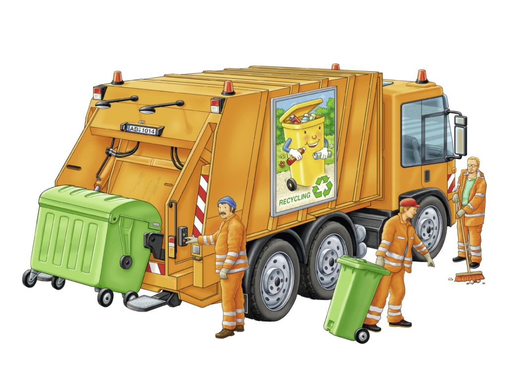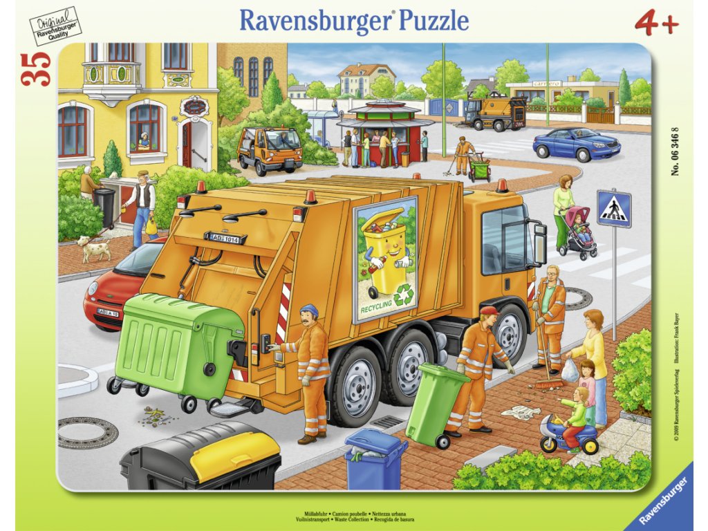Deskové puzzle s motivem Odvozu odpadu. Složený obrázek má velikost 32,5 x 24,5 cm. Obrázek je složen z 35 dílků.