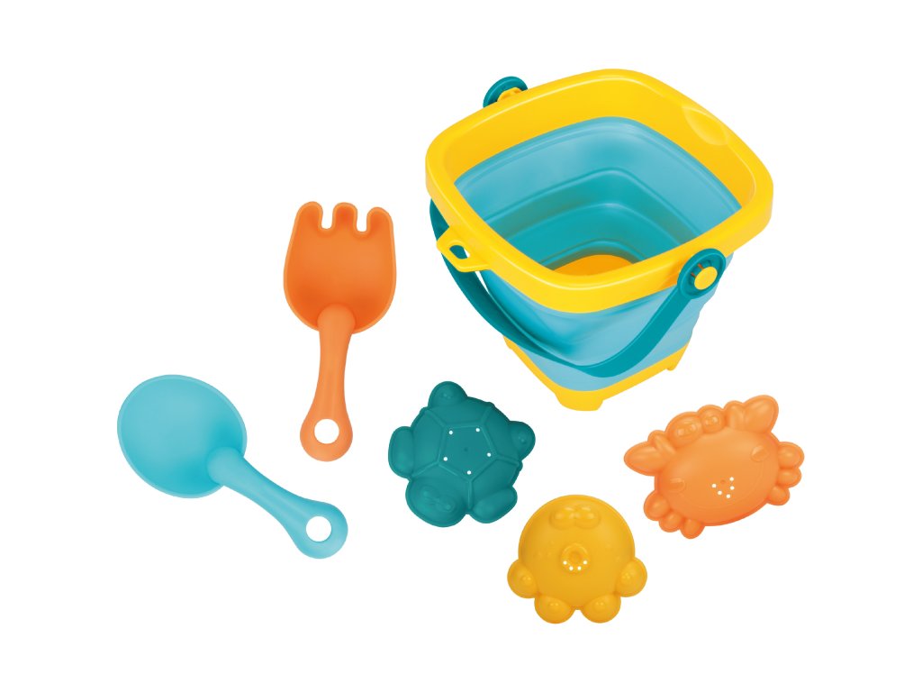 Kyblík skládací do vany nebo na písek. Obsah balení - skládací kyblík 19x18 cm, 3 formičky - želva, krab, žába, hrabičky a lopatka.