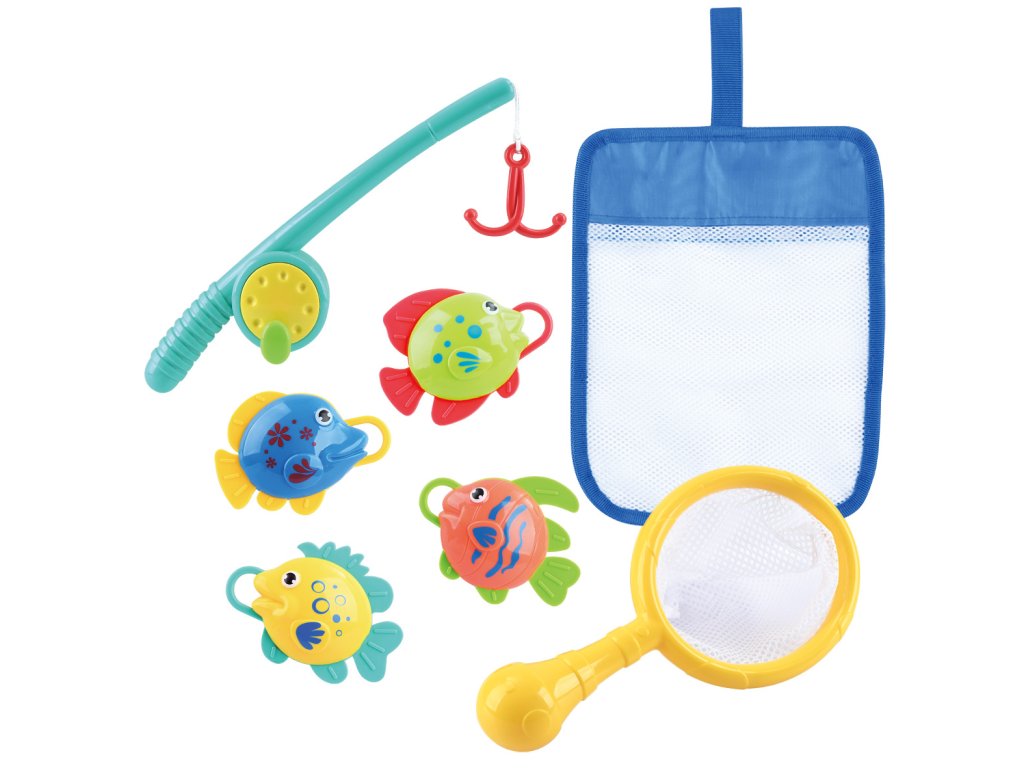 Chytání ryb do vany. Velikost udice 25 cm. Obsah - síťka, udice, 4 ryby, síťovaná taška.