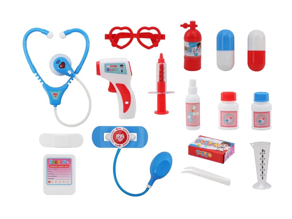 Doktorský kufřík. Velikost 30cm. Obsahuje fonendoskop, teploměr, stříkačku, pinzetu a další příslušenství pro hru na doktora. Baterie 4xAG10 součástí. světelné efekty