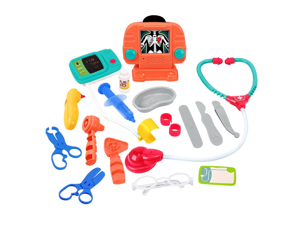 Playgo Lékařská sada. Obsahuje 19ks: fonendoskop, náplasti, kladívko, nůžky, tlakoměr, teploměr, brýle, injekci a další. Baterie součástí. světelné a zvukové efekty,